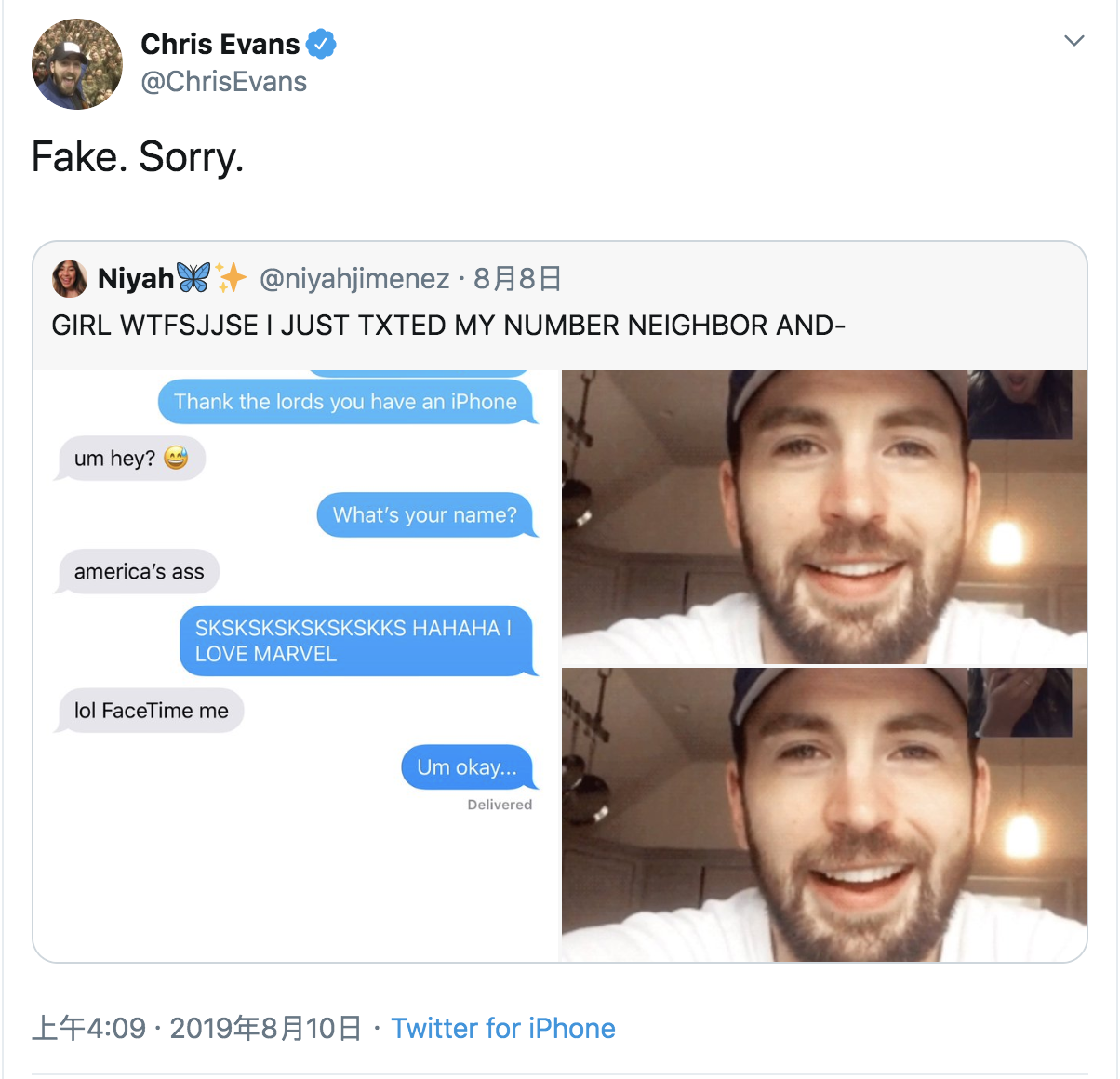 不料,電話一接起來後畫面上居然是克里斯伊凡本人,讓女網友驚訝到說不出話,並將畫面截圖放上網,告訴大家自己的「電話號碼鄰居」是美國隊長本人,引來大批網友的議論,就連克里斯伊凡本人也看到了這篇貼文,想不到,他將這篇貼文轉發並附註「對不起,這是假的」,直接揭穿電話號碼鄰居的謊言,讓女網友從夢中醒了過來。