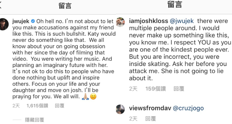事發至今凱蒂佩芮方面並沒有出面解釋,不過當年生日派對的主角造型師Johnny Wyjek則聲稱男模胡言亂語,接著爆料他在拍攝隔日就對凱蒂佩芮很有好感「你為他寫歌還計畫未來,不應該這樣對待對你的人生產生激勵的人」並鼓勵喬許克勞斯多關注自己的生活,往前邁進,喬許則回應「那天旁邊有很多人...你可先問他再來指責我,他不會說謊的」。