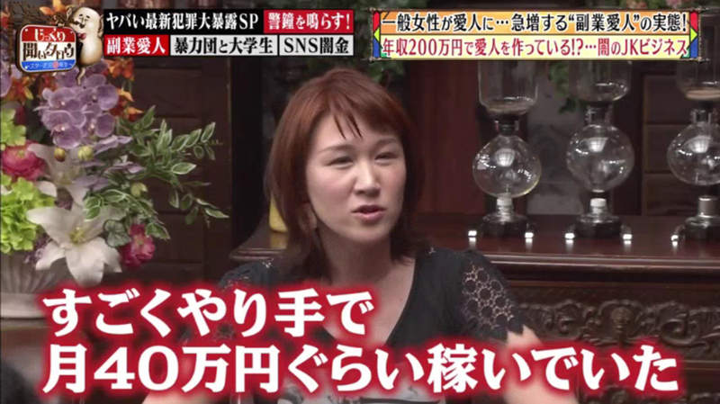 而許多女學生會因為付不起房租或是手機帳單而選擇這種可以快速賺錢的方式,年紀越年輕,價碼就越高,根據統計,東京的女學生價碼按見面次數計算一次約2.5到3萬,外縣市的女學生則是2到2.5萬,中山美里更表示,如果女學生努力一點的話,一個月的收入可達到40萬日圓,相當於台幣12萬,數目相當的可觀,讓許多家長紛紛擔心起自己的小孩是否有在做兼職,夫妻之間也會互相猜忌有沒有金援他人,成為一股歪風。
