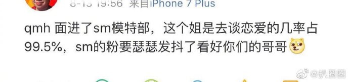 關於綦美合的爆料一出後,網友馬上表示「這個姊去談戀愛的機率高達99.5%」並說「SM的粉絲要小心了」,因為綦美合最近才和王一博鬧緋聞而頻頻上新聞版面,而之前也被網友爆料,她喜歡歐陽娜娜的誹聞男友陳飛宇。