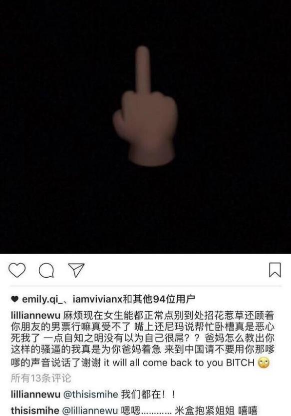 事實上,綦美合先前也被爆料喜歡大陸演員陳飛宇,還打著歐陽娜娜閨密的名號去探兩人的班,但是轉發微博宣傳兩人的電影《秘果》時,轉的是陳飛宇的微博,而不是歐陽娜娜的,網友更進一步指稱,因為陳飛宇喜歡歐陽娜娜的關係,因此沒有回應綦美合的示好,讓她心生不滿,表面上雖然還是和歐陽娜娜是好姊妹,但背地裡綦美合的閨蜜在IG上疑似對歐陽娜娜開砲,而綦美合也在底下回應,有網友還爆料,綦美合會模仿歐陽娜娜的穿搭。