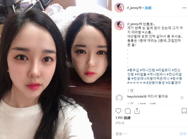 南韓女模朴珍妮(박제니)因為擁有傲人的身材,成為情趣商品業者的御用模特兒,2日,他宣布打造百分之百還原本尊的充氣娃娃,並首度公開已經完成的臉部,逼真模樣嚇壞不少網友。照片中,可見朴珍妮和自己的模型同框合照,假人的臉部從五官乃至細緻的眉毛、眼睫毛全都一一還原,作工相當細緻,就連朴珍妮都說到「晚上加班猛一看,真的會被嚇死」也向外界表示「目前充氣娃娃的身體在1樓、頭在2樓,只要組合起來就完成啦」。