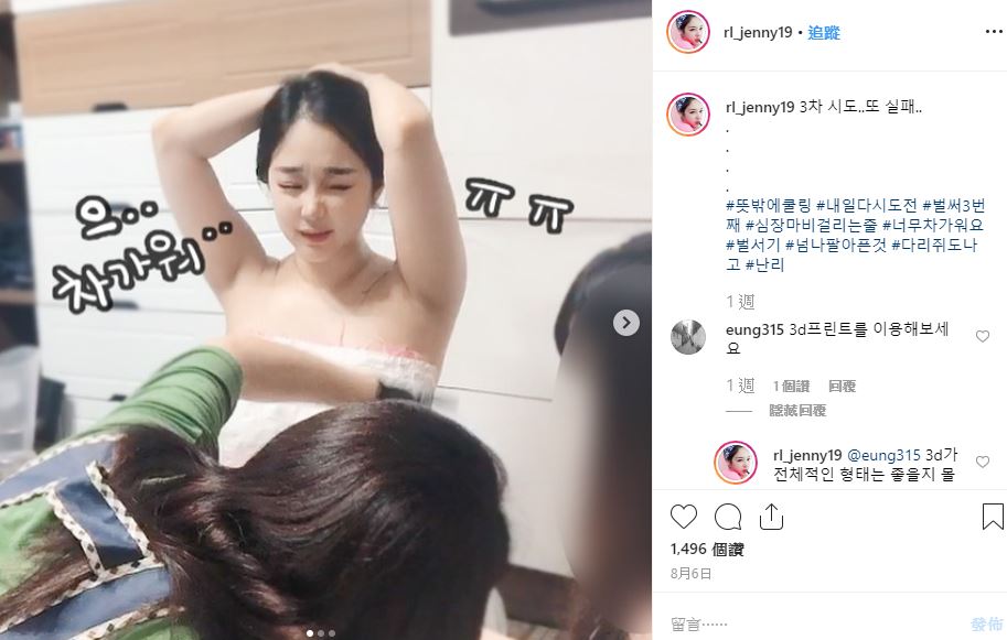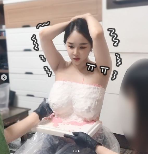 6日,朴珍妮又再度於個人IG公開製作胸部的過程,從他的表情看來似乎相當辛苦。照片中,可見朴珍妮上空入鏡,雙手高舉背在後腦勺,前胸後背裹上了厚重的白色石膏,由工作人員帶著手套慢慢調整形狀,疑似因位製作時間很長,朴珍妮面露痛苦表情,雙手甚至舉到不自覺顫抖相當辛苦。