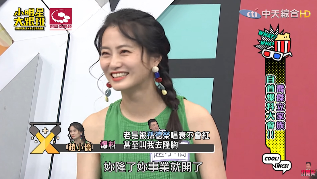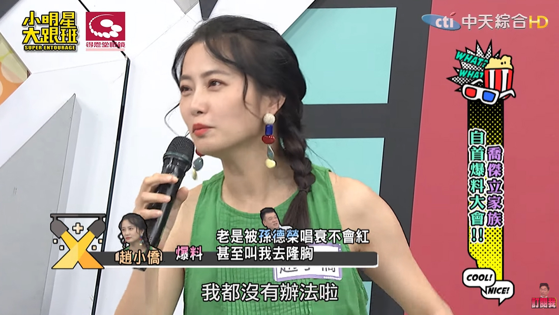 女星趙小僑與恩師孫德榮日前參加了綜藝節目《小明星大跟班》的錄製,節目中,孫德榮先是爆料趙小僑是個「自我要求低」的人,並指出趙小僑因為長相出眾,身材、學歷又好,講話也很有條理,行為舉止都很像仙女。不料,卻被主持人吳宗憲爆料:「然後你叫她去隆胸」,現在瞬間一片暴動,孫德隆還補充「我出錢耶!」,讓趙小僑覺得又好氣又好笑。