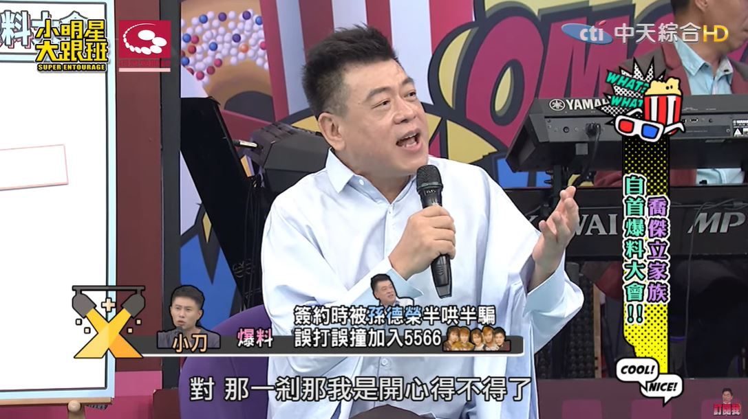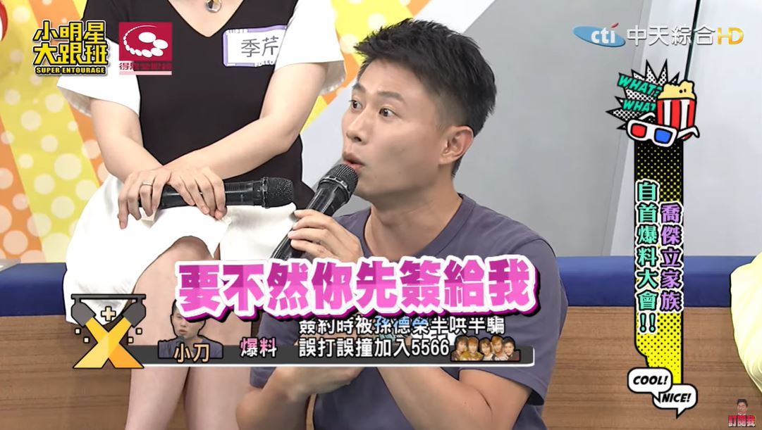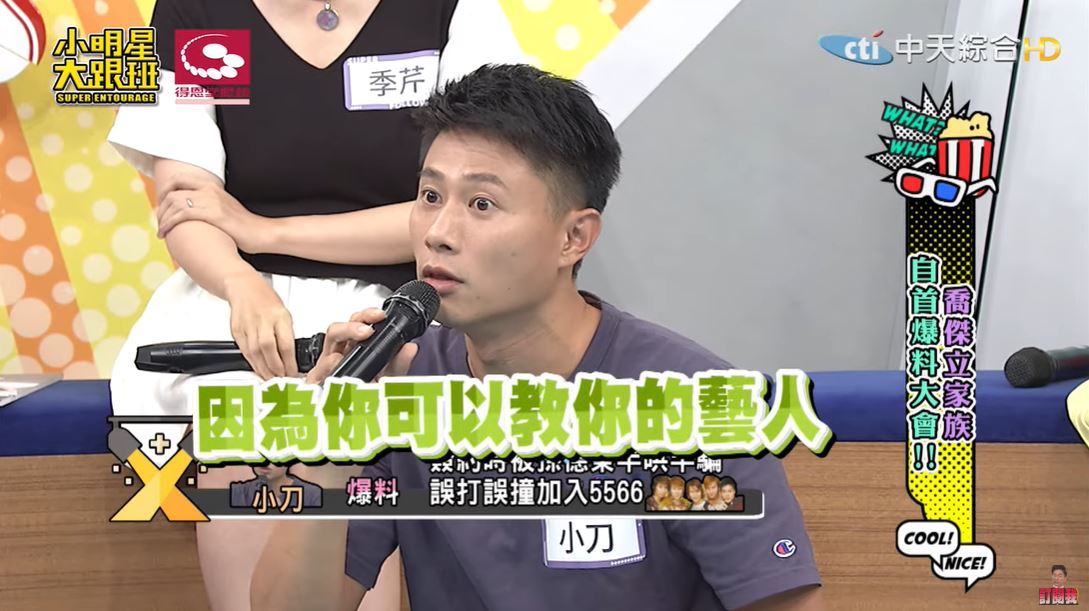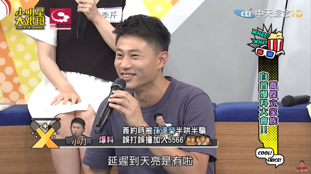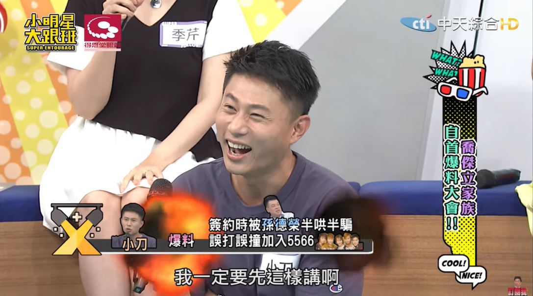 小刀在《小明星大跟班》透露,他以前其實是幕後人員,還當過何妤玟的助理,當初為了要簽合約,透過學妹介紹認識了孫德榮,沒想到孫德榮卻說:「要不然你先簽給我!」讓他聽了相當困惑,孫總告訴他,公司想找個娛樂新聞的主持人:「你簽給我,你上去主持,就可以捧紅你的藝人!」結果一簽進去,孫德榮立刻宣布「我們要組成一個男生團體!」還盯著他準備每一次評比的表演,為了可以說服他,孫德榮還說:「你就努力學,因為你可以教你的藝人」於是他就這樣被半哄半騙進入了演藝圈。