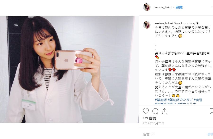 2017年10月,福井還是慶應大學藥學部的五年級生,也在IG曬出穿著白袍在藥局實習的照片,當時就首度登上男性雜誌《周刊Play boy週刊プレイボーイ》。其後,福井的拍攝邀約不斷,也曾經有以穿著白袍拍攝的性感照片,更登不少媒體包括《Oricon》、《Yahoo》,更大膽挑戰尺寸偏小的內衣和泳衣拍攝,大展豐滿上圍,當時就有不少網友湧入福井於IG公開他首度替《周刊Play boy週刊プレイボーイ》拍攝的寫真照中大讚「せりな(福井名字)的時代來臨了」、「不僅有身材又有腦」。