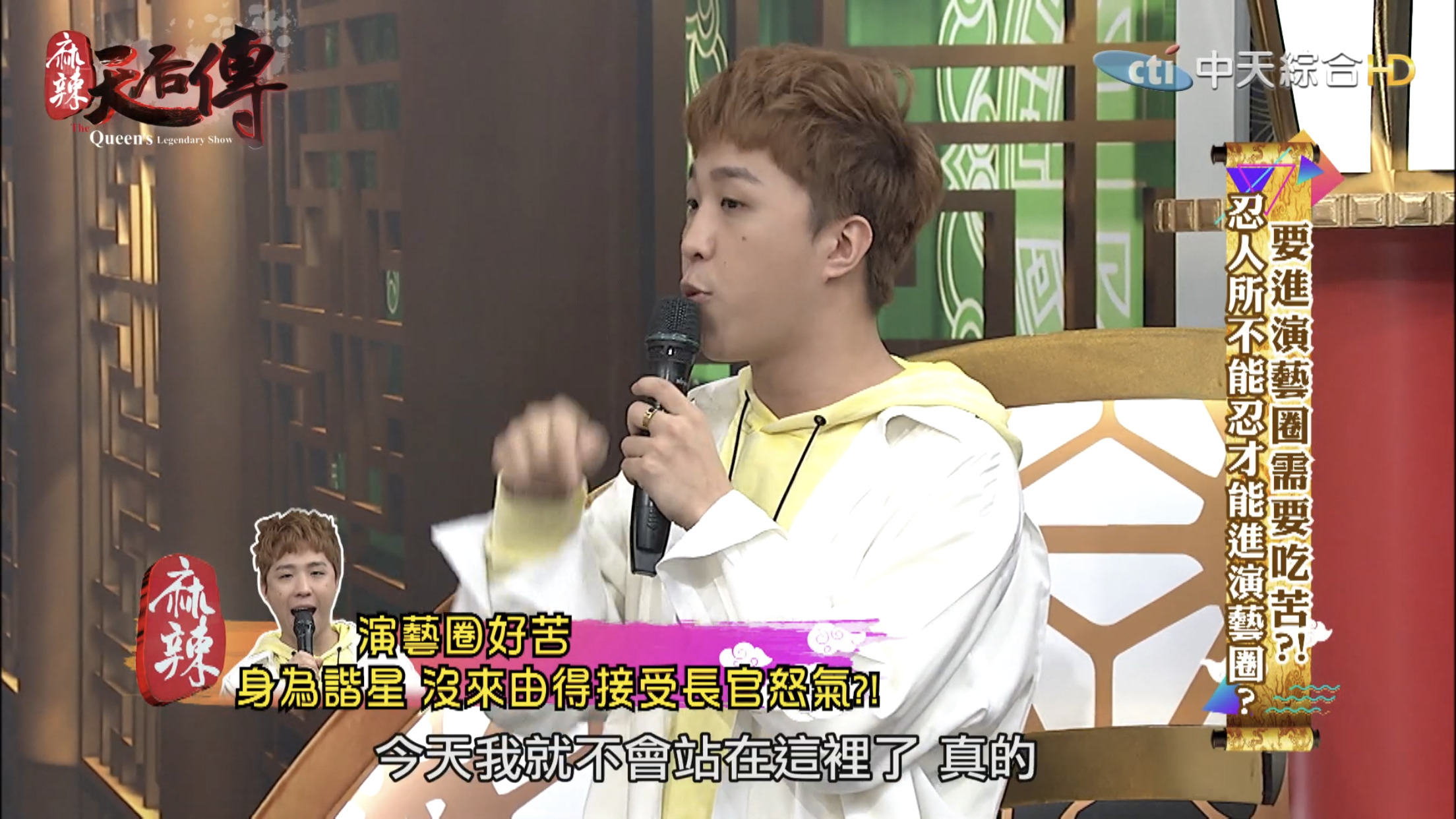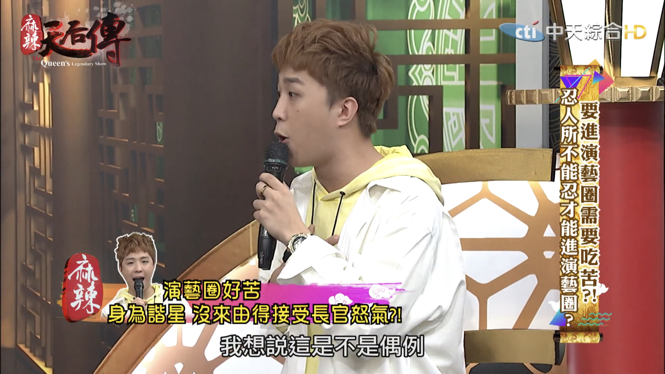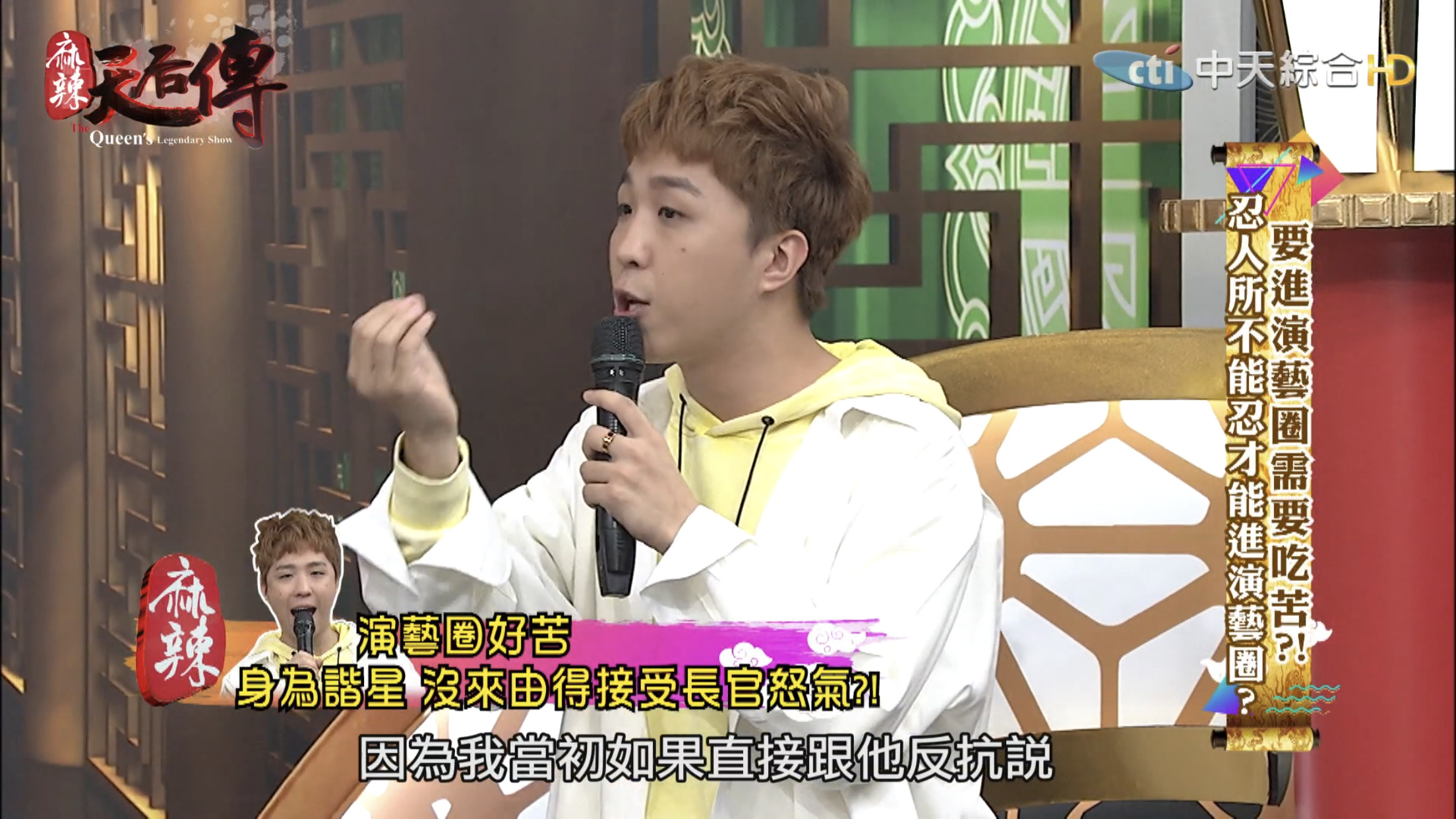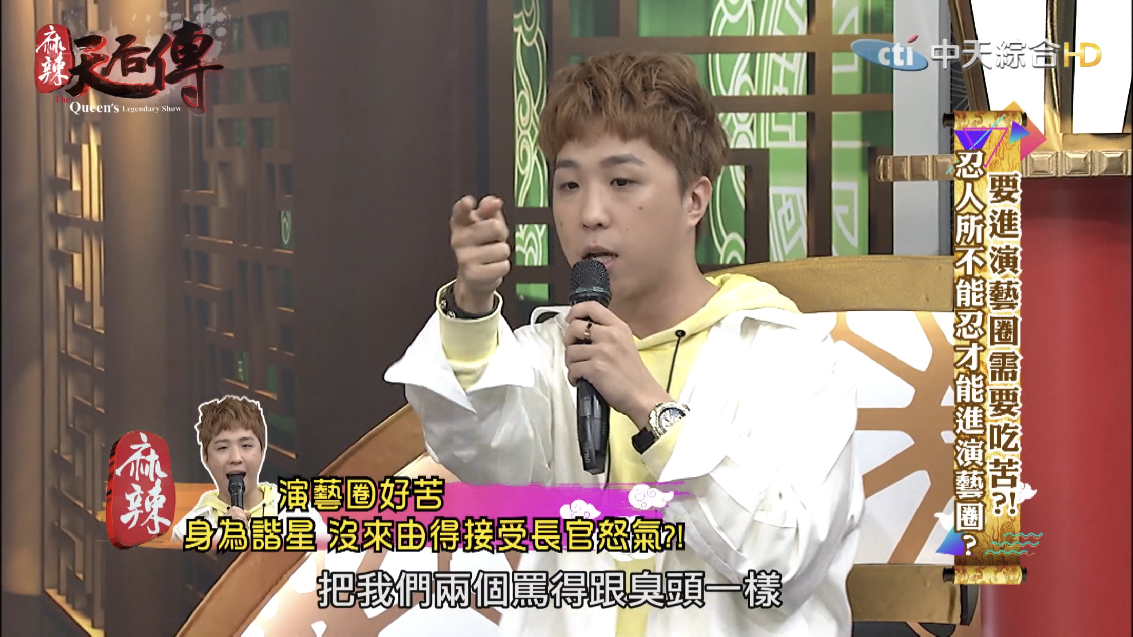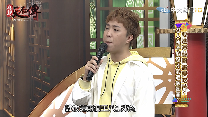 這集節目主題為「要進演藝圈需要吃苦?!」,邀請藝人分享出道至今經歷哪些苦不堪言的事情。大根表示10幾年前自己剛出道時,那時候15、16歲,和另一個藝人一起錄製節目時,曾耳聞製作人脾氣不好,但是不曉得原因,當天製作人一進攝影棚就開始對著大根和另一名藝人飆罵,「誰放這2個王八蛋來的?」,接著罵了一連串的三字經,而當時經紀人、主持人和所有工作人員都在場。