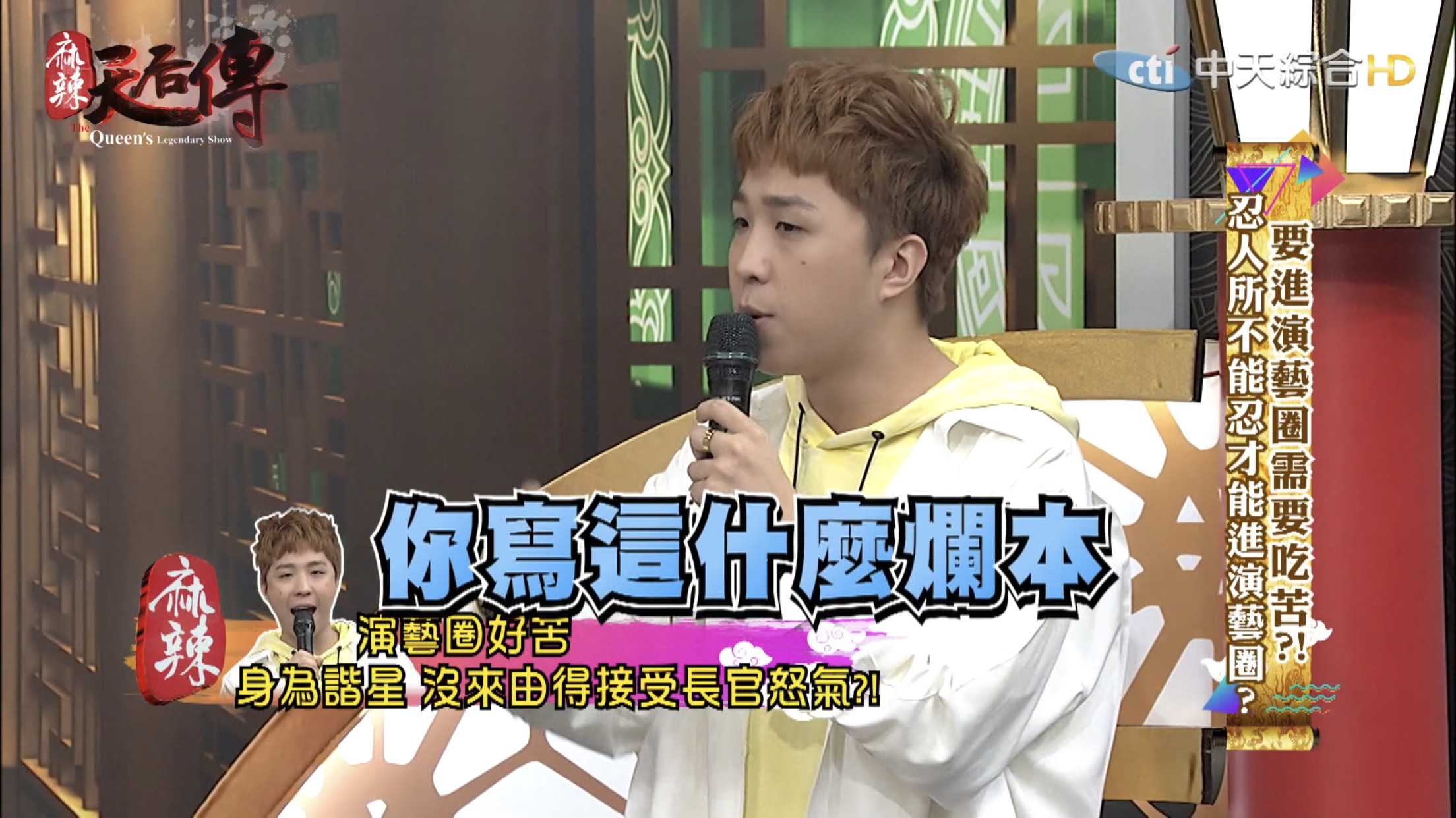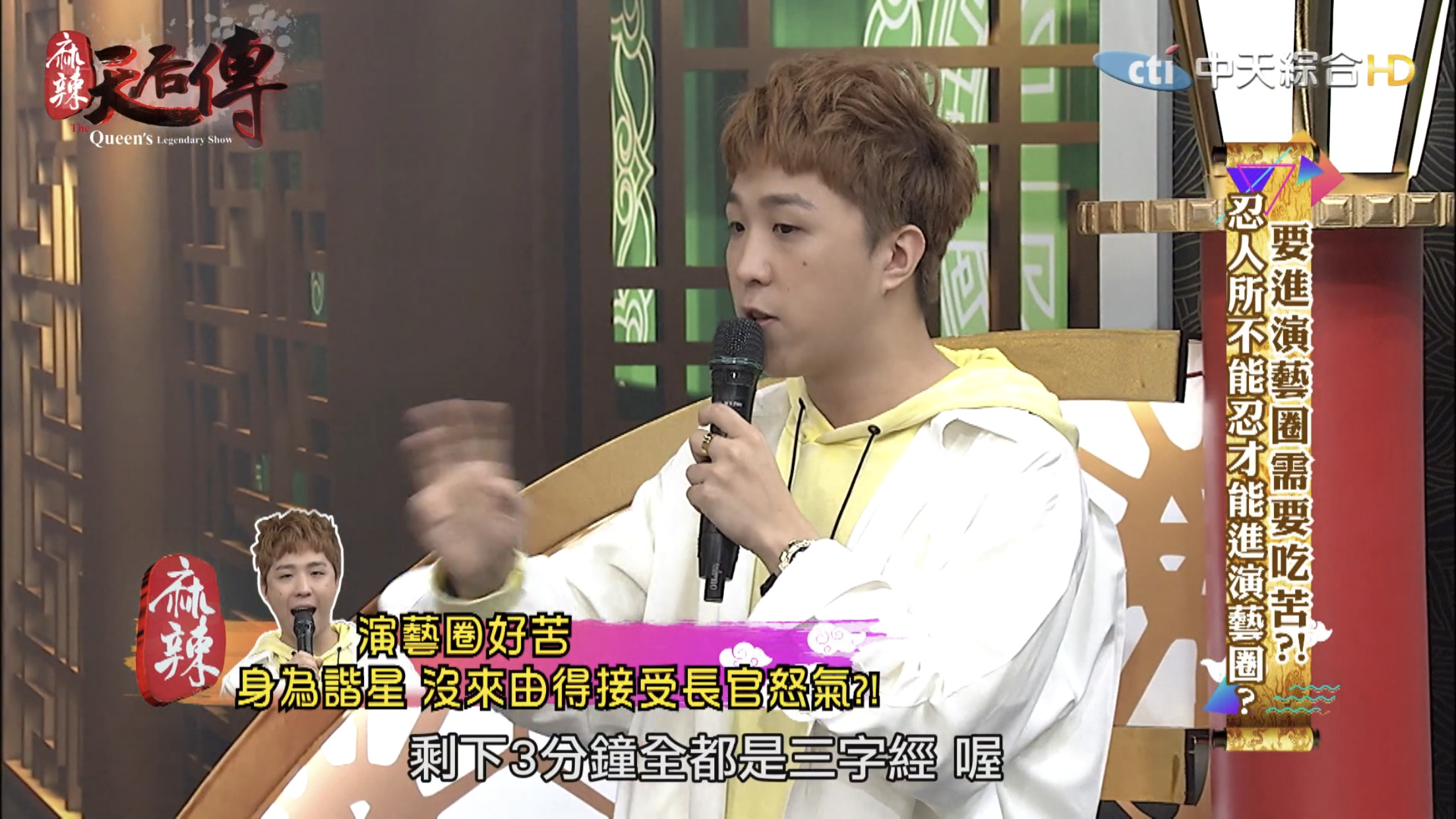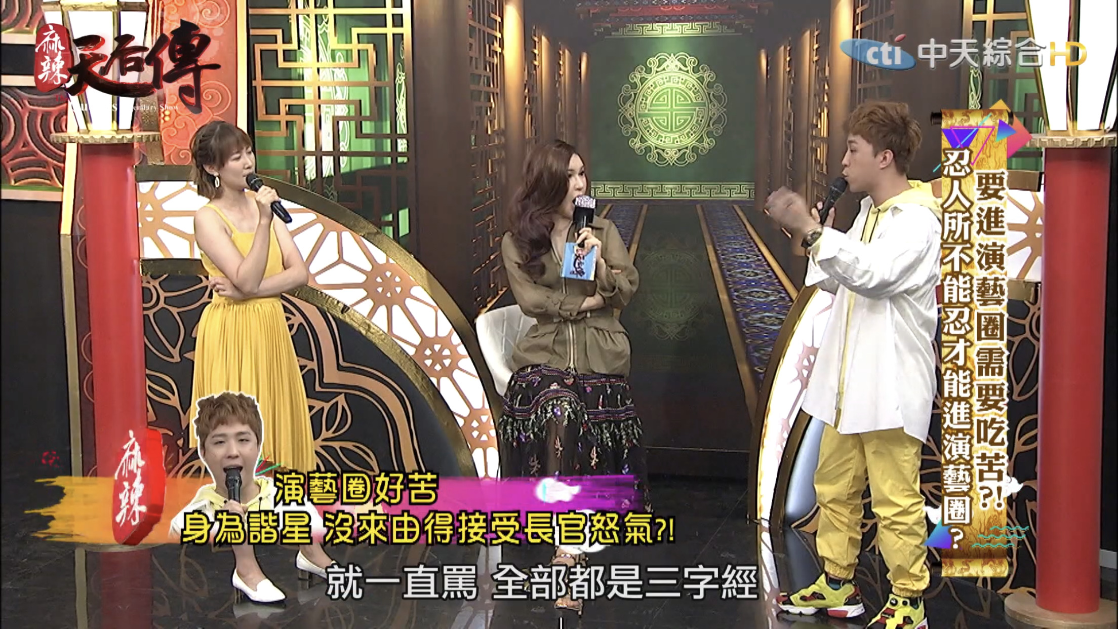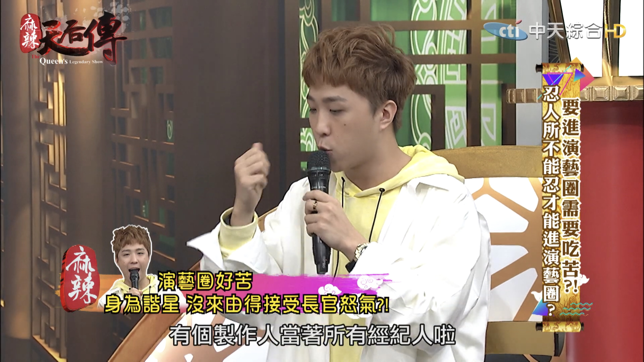 這集節目主題為「要進演藝圈需要吃苦?!」,邀請藝人分享出道至今經歷哪些苦不堪言的事情。大根表示10幾年前自己剛出道時,那時候15、16歲,和另一個藝人一起錄製節目時,曾耳聞製作人脾氣不好,但是不曉得原因,當天製作人一進攝影棚就開始對著大根和另一名藝人飆罵,「誰放這2個王八蛋來的?」,接著罵了一連串的三字經,而當時經紀人、主持人和所有工作人員都在場。