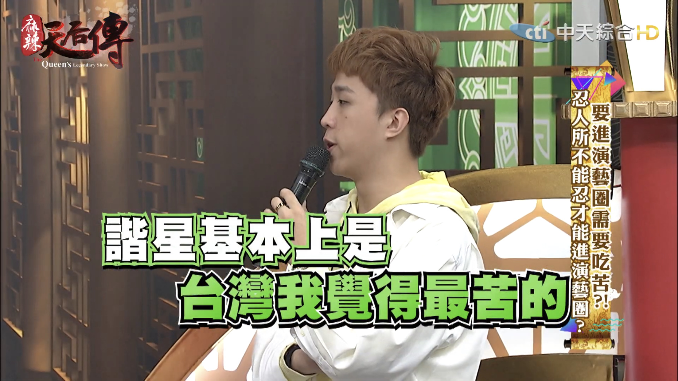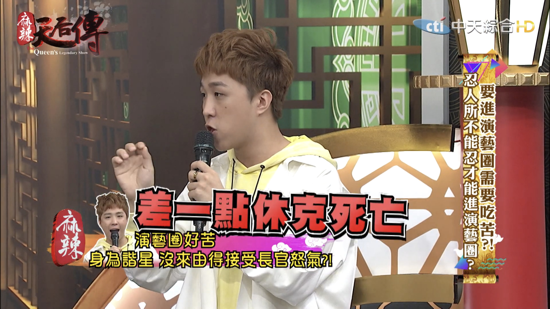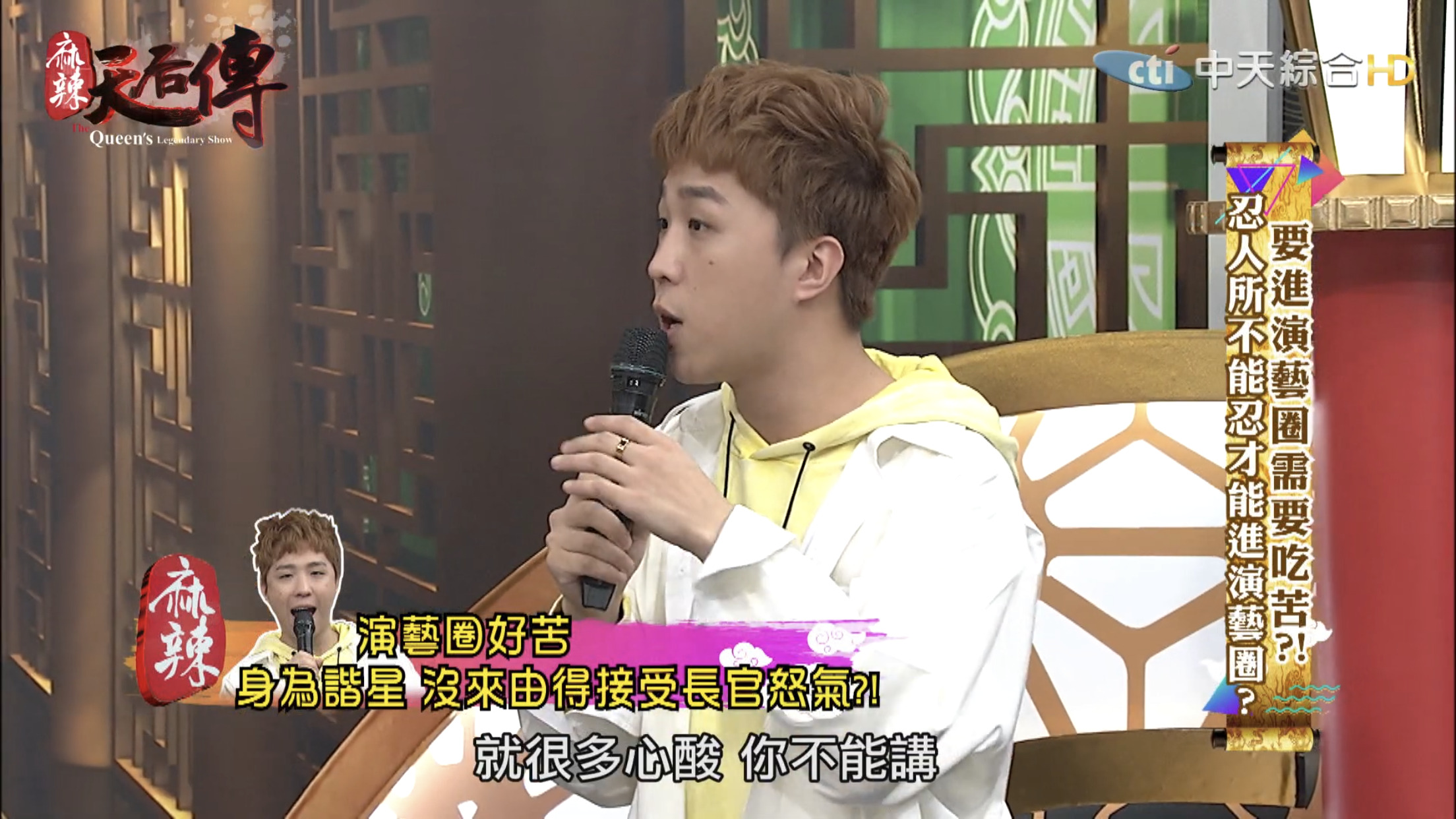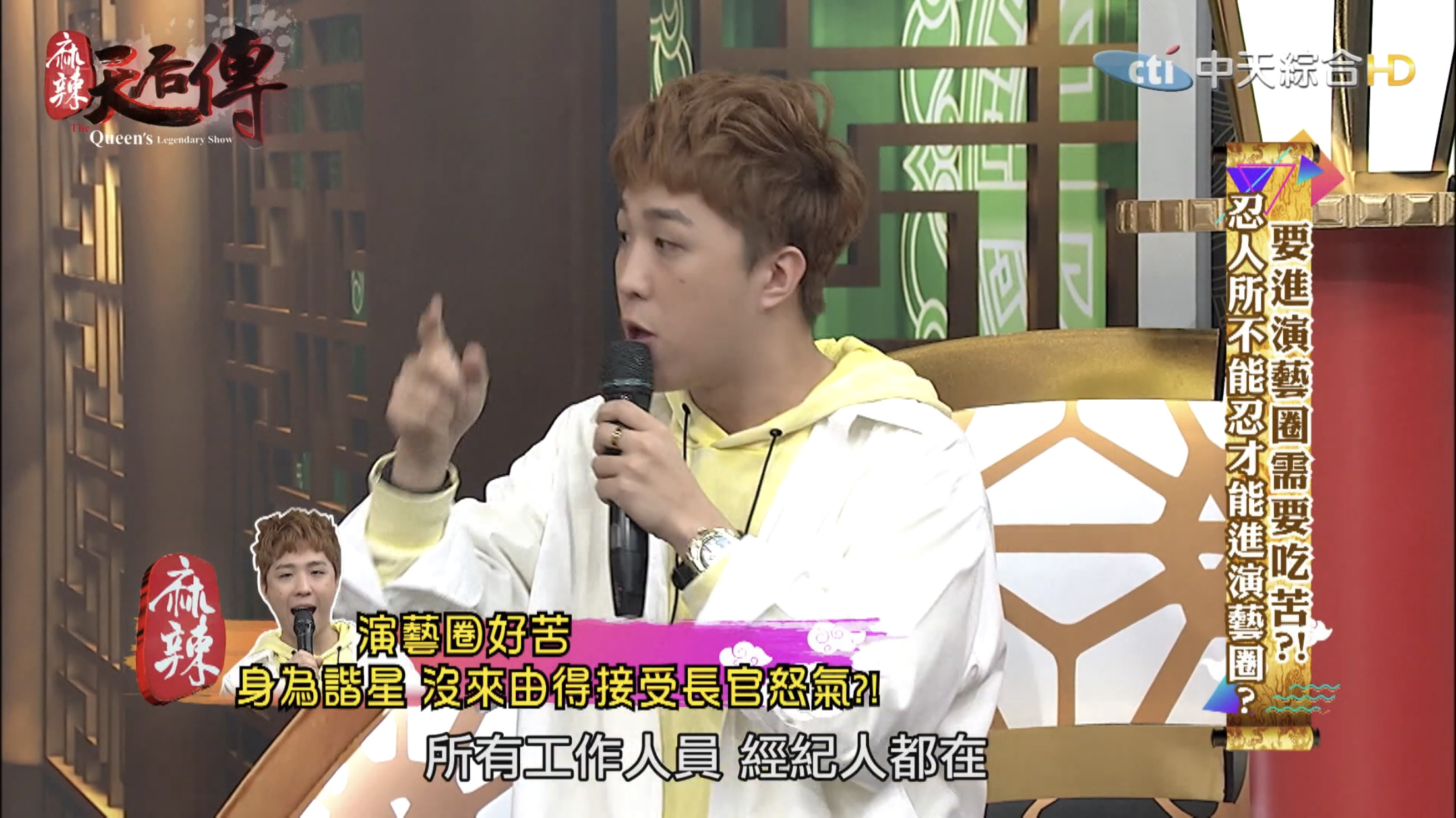 這集節目主題為「要進演藝圈需要吃苦?!」,邀請藝人分享出道至今經歷哪些苦不堪言的事情。大根表示10幾年前自己剛出道時,那時候15、16歲,和另一個藝人一起錄製節目時,曾耳聞製作人脾氣不好,但是不曉得原因,當天製作人一進攝影棚就開始對著大根和另一名藝人飆罵,「誰放這2個王八蛋來的?」,接著罵了一連串的三字經,而當時經紀人、主持人和所有工作人員都在場。