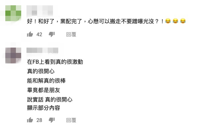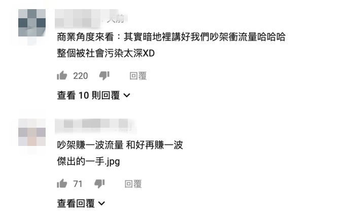 丁特、花輪合好影片貼出後,引來不少粉絲表示,「能和解真的很棒」、「終於有機會看到吵翻天的雙人實況了」、「看到那個擊掌的畫面有點想哭」。但也有不少網友批評,「假吵架真工商?」、「吵架賺一波流量,和好再賺一波,傑出的一手.jpg」、「原來是Uber Eat的工商啊,我還以為和解了」