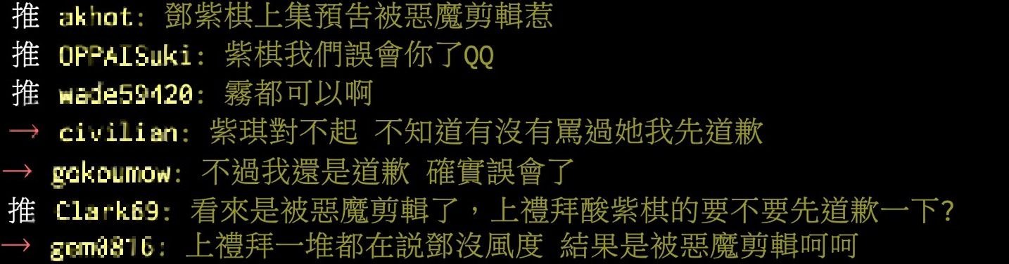 然而在第10集播出後也還原了真相,當時鄧紫棋會說出這句話是因為熱狗戰隊的新秀在第一輪中成為第一位出戰的選手,而他挑選了劉炫廷進行PK,最終新秀以52票勝出,直接晉級6強,這時鄧紫棋就笑著和潘瑋柏說了:「狗哥現在可以收工了,後面沒他的事了都進了」,而節目還原了真相後,許多網友也在PTT討論串中紛紛向鄧紫棋道歉:「鄧紫棋上集預告被惡魔剪輯了」、「紫棋我們誤會你了QQ」、「紫棋對不起 不知道有沒有罵過她我先道歉」、「不過我還是道歉 確實誤會了」