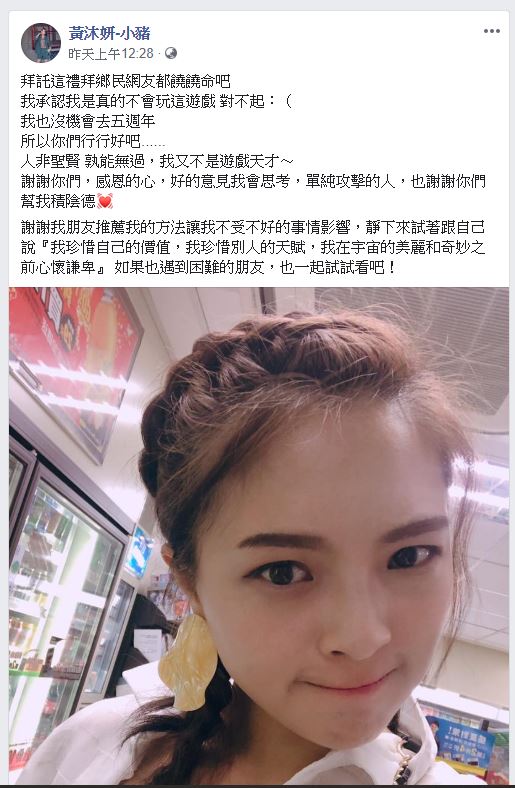 面對這些批評,「小豬」於18日中午時,在其粉絲專頁上發文求饒,直呼「拜託這禮拜鄉民網友都饒饒命吧!我承認我是真的不會玩這遊戲,對不起」,隨後也表示自己已和五週年之旅無緣,希望網友們別再批評她了,更語重心長地表示「好的意見我會思考,單純攻擊的人,也謝謝你們幫我積陰德」,展現出高EQ的一面。