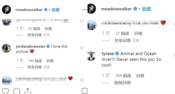 對此也有不少網友甚至同劇演員出面回應。包括在劇中飾演保羅沃克青梅竹馬「羅曼皮爾斯(Roman Pearce)」的演員泰瑞斯吉布森(Tyrese Gibson),就驚訝表示「動物和海洋的狂熱分子!從來沒看過這畫面!太酷了」,螢光幕夫婦喬丹那布魯斯特(Jordana Brewster)也留言「好愛這張照片」,梅朵也澤回應她也一樣,同時熱情表示「我也愛你」。