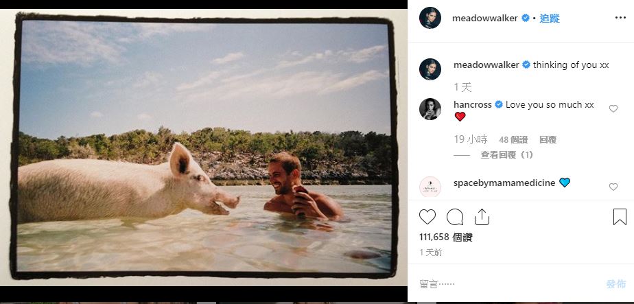 然而女兒梅朵並沒有喪氣更以不同方式緬懷父親,像是保羅沃克生前就致力於環境保護和人道救援,他也為此成立「保羅沃克基金會」,此外也會在個人IG連年公開爸爸的照片。時隔兩年沒有更新照片,18日梅朵突然發表一張保羅沃克和豬在水裡嬉戲的照片,並在文中表示「thinking of you xx」表達對父親的思念之情。