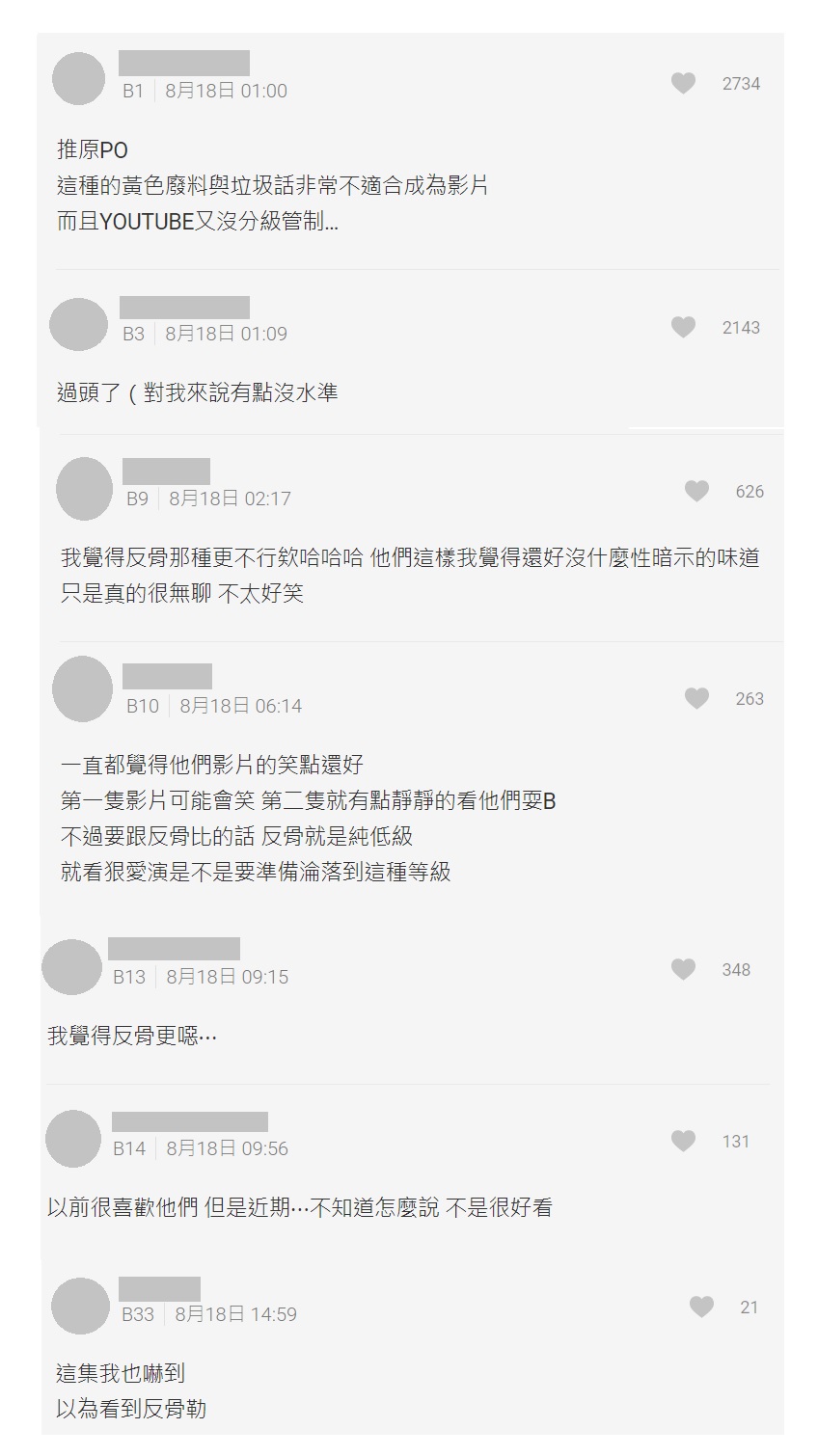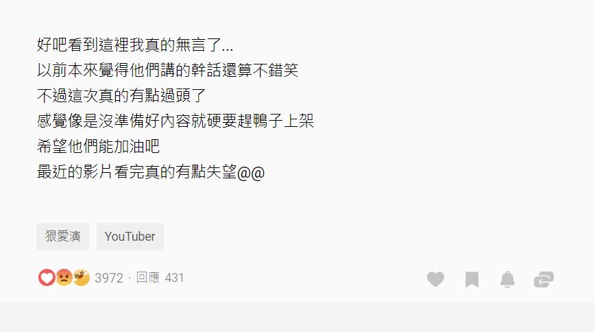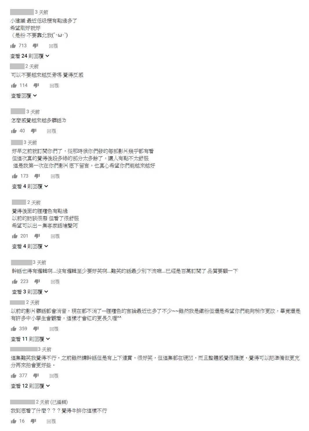 而此段影片上傳後,也令許多粉絲們紛紛留言表示「小建議:最近低級梗有點過多了!希望剛好就好」、「怎麼感覺越來越多髒話了」、「這次真的覺得後段多綠的部分太多餘了,讓人有點不太舒服」、「已經是百萬訂閱了!品質要顧一下」,道出了許多粉絲的憂心之處。