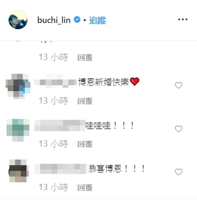 林辰將照片貼出後,震驚不少粉絲,同時也有許多網友留言,「恭喜博恩!!!!」、「博恩新婚快樂」、「欸!是新婚現場」、「謝謝buchi替粉絲捕捉現場鏡頭」、「博恩超帥ㄟ新娘也好美!」。
