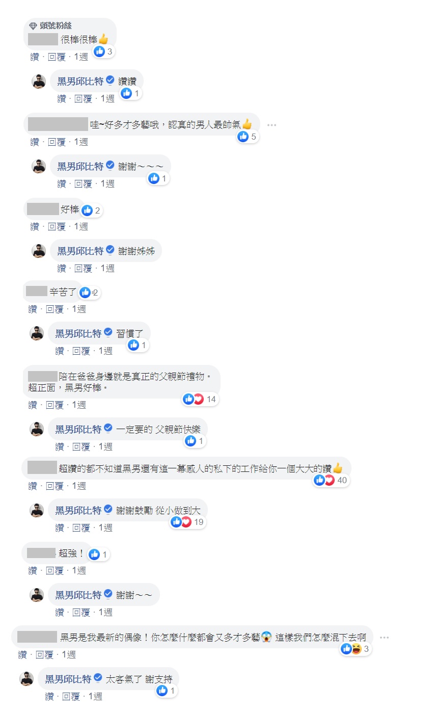除此之外,「黑男」也不忘祝福一直辛勞地做著這個工作的父親「父親節快樂,老爸辛苦了」,表達對父親滿滿的敬愛之意,而這段溫暖的影片也獲得許多人的讚賞,紛紛留言表示「哇~好多才多藝哦,認真的男人最帥氣」「陪在爸爸身邊就是真正的父親節禮物。超正面,黑男好棒。」「太感人」「好佩服你,讚」。