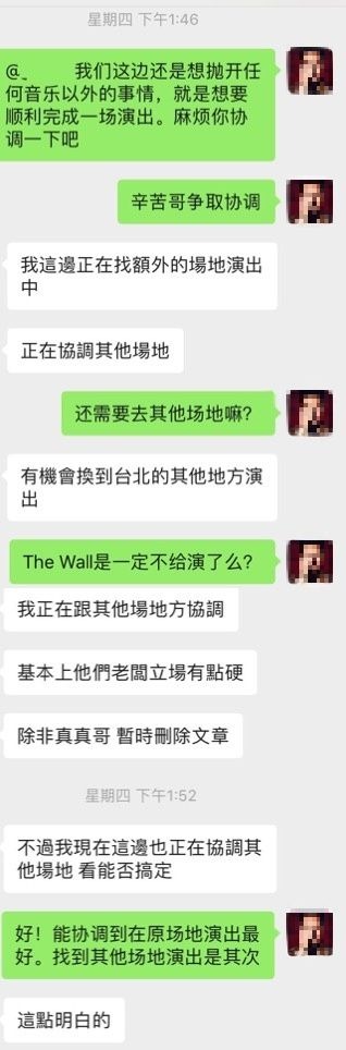 對此《台灣達人秀》取得徐真真團隊的獨家訪問,也還原當時雙方協商的過程,徐真真團隊表示當時有提出可以自費增加保全,維持現場的安全,但這項提議也被The Wall回絕,接著提到關於臨時更換場地的事宜,當下搜尋其他台北演出的場地時發現了都已經沒有檔期,當時台灣當地的承辦人協助聯繫到了一家夜店可以接納本場演唱會,但在夜店表演的話硬體設備不足以達到專場的演出規格,團隊方也提到The Wall在協商時並未提到「延期舉辦」的選項,和The Wall公告上有些出入。