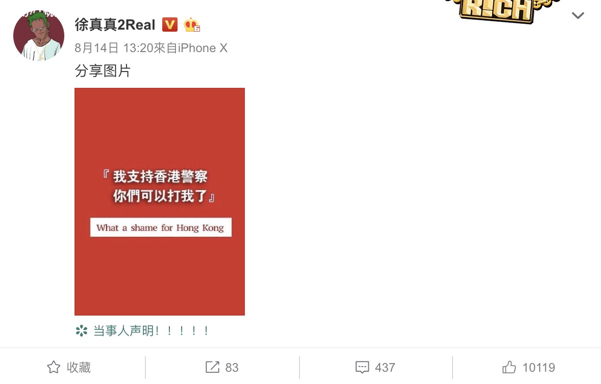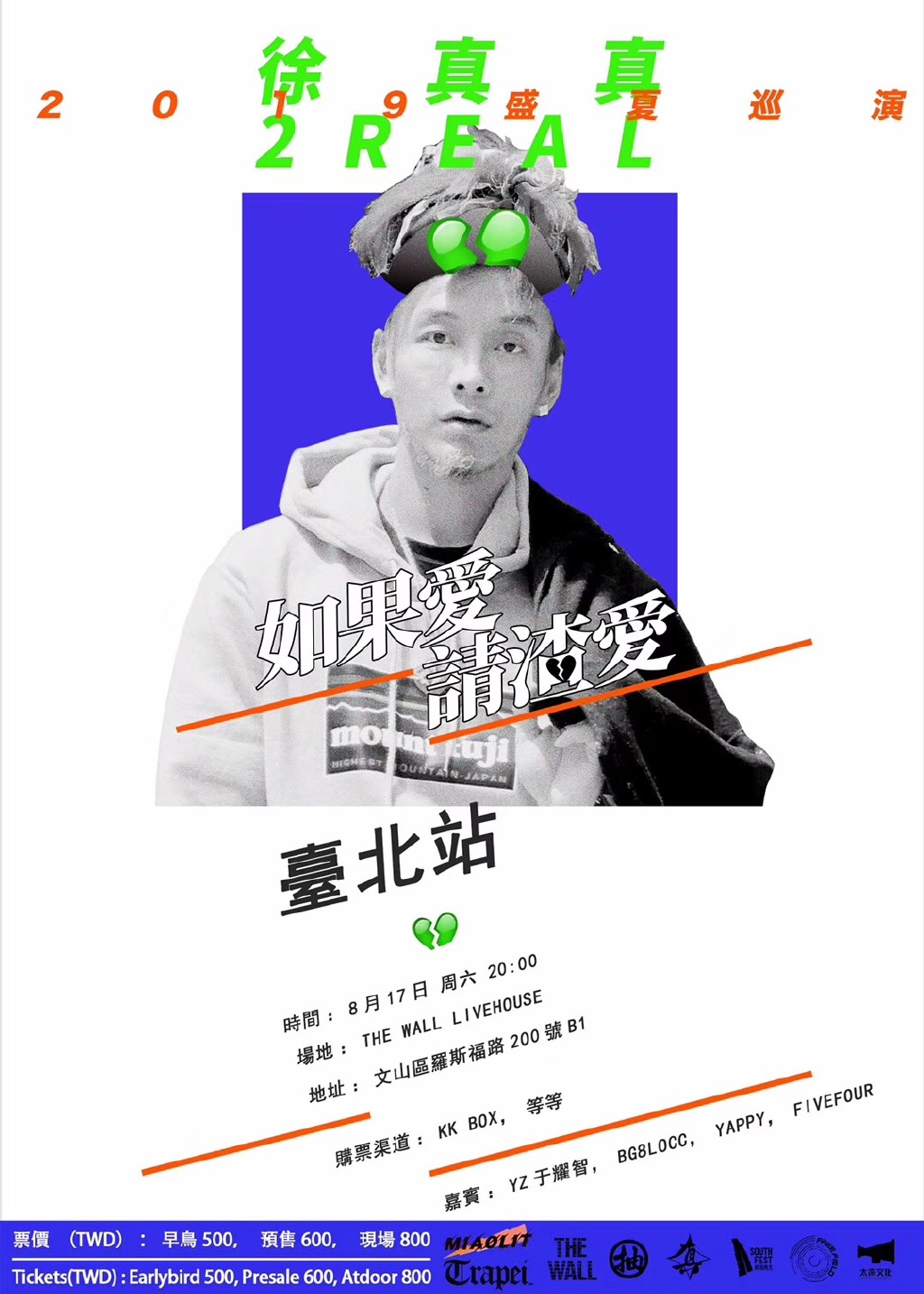 在2017年因參加《中國有嘻哈》而爆紅的大陸說唱歌手「徐真真」原訂在8月17號將在台北舉辦演唱會,但The Wall卻在演出前兩天晚間發了一則貼文說道:「因現場維安考量,本場次演出取消」,突如其來宣佈取消演唱會也引來外界多方揣測,而在The Wall發出公告的隔兩天(17)徐真真團隊在IG上發出取消聲明,並公開原因是因為The Wall提出要求徐真真刪除在微博上表態支持香港警察的貼文,但團隊拒絕刪除,雙方協商失敗,導致台北演唱會直接取消。對此,《台灣達人秀》也獨家取得徐真真團隊的說詞,回應外界的揣測與疑問。