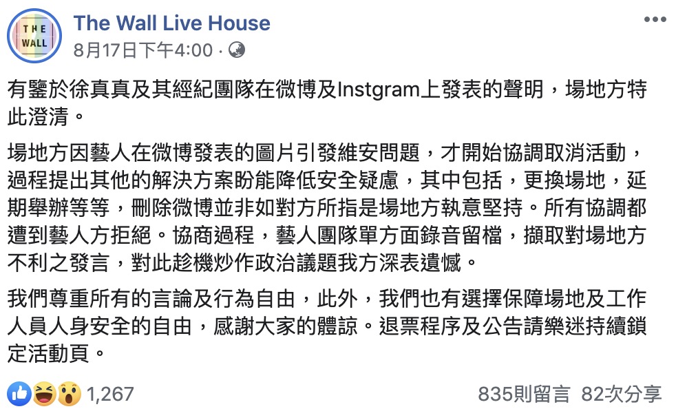 徐真真團隊在17號也在微博以及IG上發出聲明公告,內文提及:「取消原因如下:台北的巡演地方在徐真真與團隊到達台灣後要求我們刪除徐真真在8月14日發的『我支持香港警察,你們可以打我了』的微博,才可以演出」,在雙方多次協商下並沒能達成協議,因此取消演出,針對此公告The Wall也回應:「場地方因藝人在微博發表的圖片引發維安問題,才開始協調取消活動,過程提出其他的解決方案盼能降低安全疑慮,其中包括,更換場地,延期舉辦等等,刪除微博並非如對方所指是場地方執意堅持。所有協調都遭到藝人方拒絕。」,更表示藝人團隊單方面錄音留檔,並擷取對場地方不利之發言。