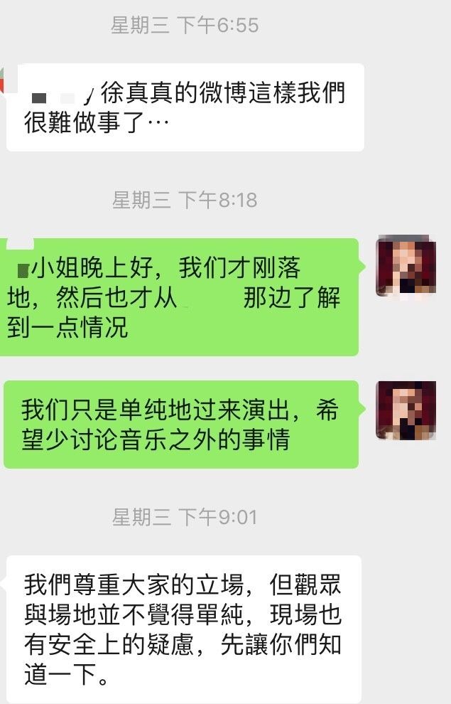 徐真真在8月14號時於微博上分享了支持香港警察的標語圖,而團隊們也在14號時前來台灣進行演出的前置作業,而當團隊下飛機後就接到台灣承辦方的電話,該位人員傳達了「The Wall那邊希望徐真真能夠將該條貼文刪除」的訊息,但當時經紀人認為這件事和音樂並沒有相關聯性,因此當下先拒絕了The Wall的要求,但同時也和對方強調「並沒有帶著任何政治立場」,更提出「希望不要關心音樂以外的事情」,只希望能夠完整的進行演出,但The Wall也回應:「這件事已經不單純了,我們沒辦法容許你們在這邊舉辦所謂『單純的演出』」,拒絕了提議。