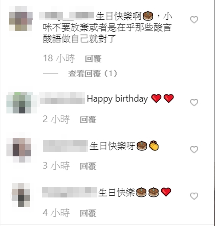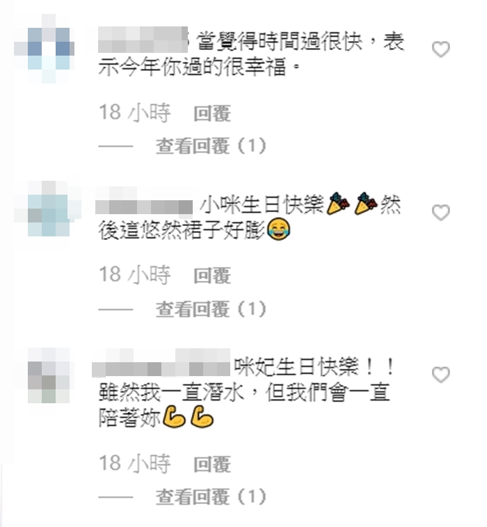 粉絲們看完咪妃的心聲後,除了紛紛送上生日祝福,也替咪妃加油,「小咪不要放棄或是在乎那些酸言酸語,做自己就對了!」、「妳會遇到真正的幸福的!」、「雖然一直潛水,但我們會一直陪著妳!」、「接下來的日子也要加油喔!」。