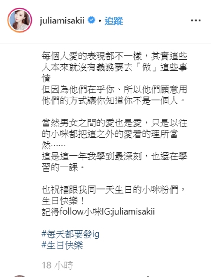 咪妃也提到,每個人對愛的表現都不一樣,沒有義務要去做哪些事情,但是因為在乎,所以願意用自己的方式讓對方知道「不是一個人」。最後咪妃坦言今年學習到最深刻的一課,「男女之間的愛也是愛,只是以往的小咪都把這之外的愛看的理所當然,這是這一年我學到最深刻,也還在學習的一課」。
