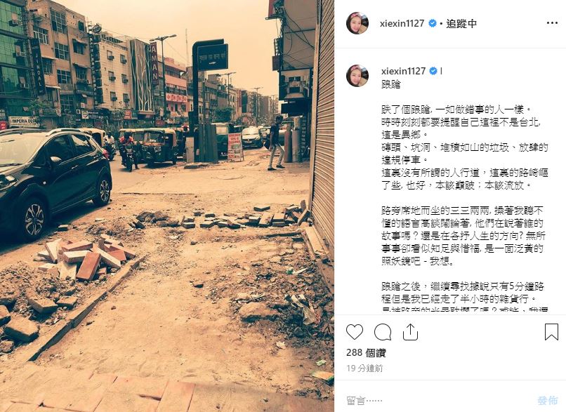 謝忻在貼文一開頭就寫著「踉蹌」,似乎是她的心情寫照,接著感性說:「跌了個踉蹌, 一如做錯事的人一樣。時時刻刻都要提醒自己這裡不是台北, 這是異鄉。磚頭、坑洞、堆積如山的垃圾、放肆的違規停車。這裏沒有所謂的人行道,這裏的路崎嶇了些,也好,本該巔跛;本該流放。路旁席地而坐的三三兩兩,操著我聽不懂的語言高談闊論著,他們在說著誰的故事嗎?還是在各抒人生的方向?無所事事卻看似知足與惜福,是一面泛黃的照妖鏡吧-我想。」