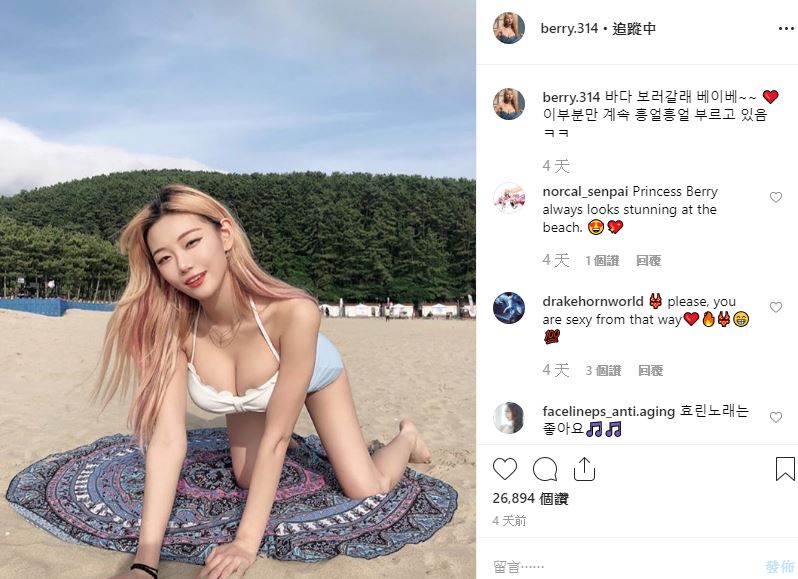 韓國實況主Berry(빛베리)現年僅23歲不過早結婚的他也已經是一個孩子的媽,卻仍保有凹凸有致的身材讓他的人氣居高不下,至今仍持續在遊戲平台TWITCH直播,個人IG也有超過26萬人追蹤。擁有好身材的Berry時常公開不少清涼照,近日一張跪趴在海灘的比基尼照,性感姿勢就引起大批網友興奮表示「超想去海灘」!