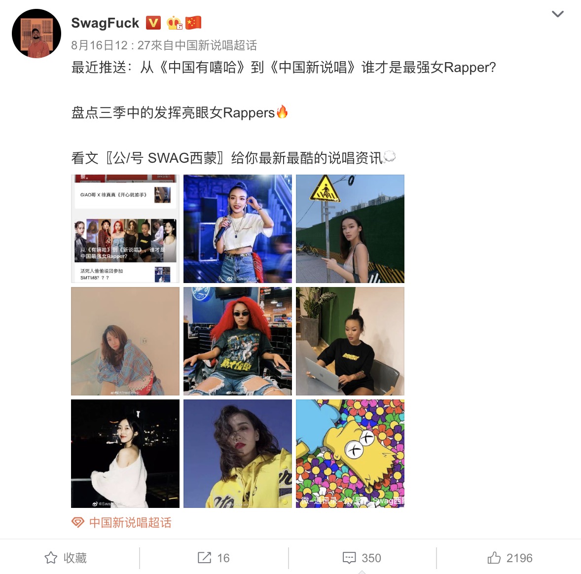 大陸嘻哈選秀節目從2017年由《中國有嘻哈》展開序幕,接著在2018年時改名推出《中國新說唱》,在今年6月時再推出第二季,總共三季的節目裡捧紅了許多說唱好手,也有許多選手在賽後在嘻哈圈中獲得很好的發展,也陸續推出許多膾炙人口的作品,而在這三季節目中也出現了許多女Rapper的身影,就有嘻哈博主選出了這三季中的13位女Rapper,留言區中網友也紛紛寫下自己支持的女選手。