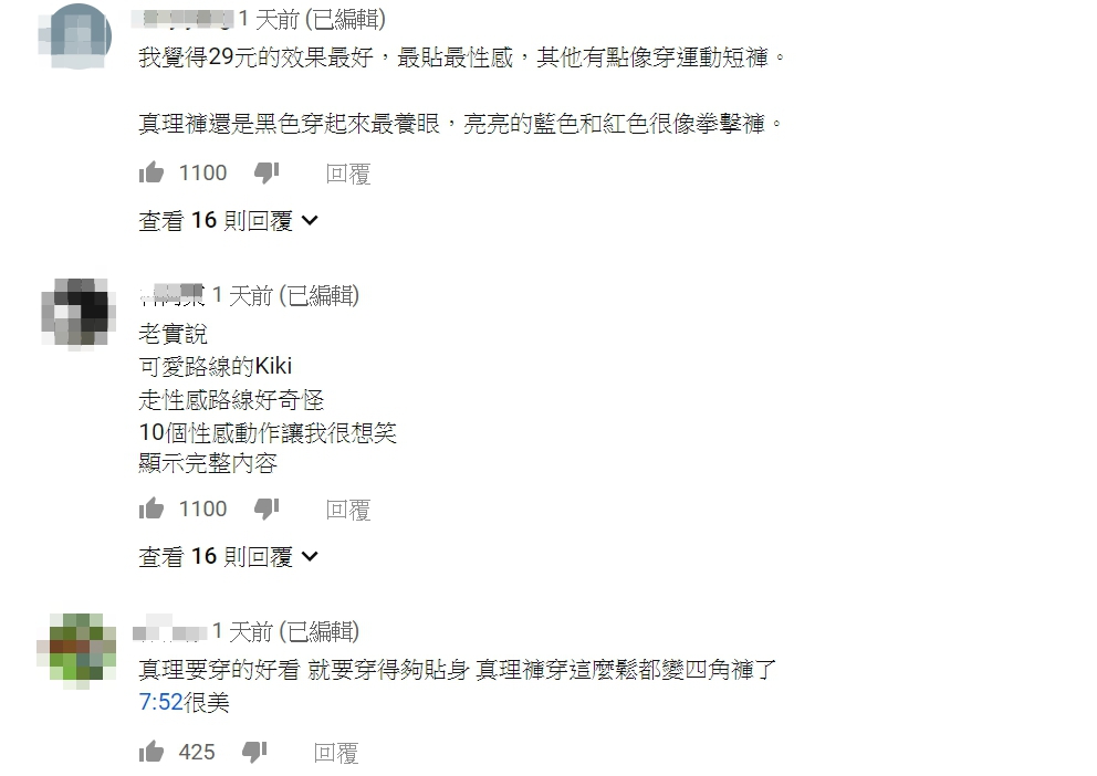 Kiki表示29元的真理褲穿起來就像緊身褲一樣,材質也比較粗糙,而1290元的真理褲是由知名運動品牌製造的,雖然品名不叫真理褲,但因為設計和真理褲的原理一樣,因此她也歸納進這次真理褲實測中,她進一步表示,價格有表現在褲子的鬆緊彈性表現上,影片中,Kiki穿著一件貼身短版灰色上衣,下搭真理褲擺出各種性感姿勢,在床上伸懶腰時甚至露出纖細、性感的小蠻腰。