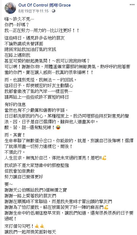 Grace在臉書寫著「我…正在努力…用力的…比以往更好!」也謝謝身邊的朋友替他加一打氣,「這段日子,即使親密的好友主動關心,我都會像洩了氣的汽球…一樣沮喪…請再給上一些些或許不算短的時日」,疑似還走不出被出軌的傷痛。