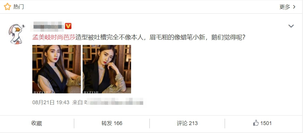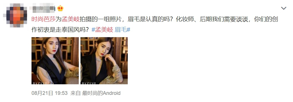過去孟美岐為時尚雜誌《時尚芭莎》拍攝的照片引起網友瘋狂討論,因為這張照片的妝容和她以往出現在大眾的面貌完全不一樣,照片中孟美岐畫上了超深色的眉毛、使用大地色的眼影、粗厚的眼線一路往上勾,配上朱紅色的大紅唇,第一眼見到幾乎認不出是孟美岐本人。