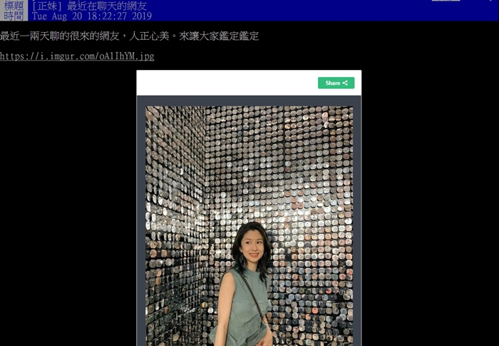 鄉民前幾天在批踢踢表特版PO文寫下,「最近一兩天聊的很來的網友,人正心美,來讓大家鑑定鑑定」,文章中也附上許多該名女網友的照片,只見照片中的女生超越網美等級,氣質出眾,甜甜一笑就能擄獲大票男子的心!