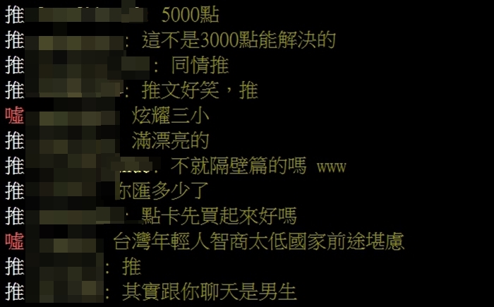 文章一出後,立刻讓其他鄉民覺得女生「太漂亮」,紛紛吐槽回應原PO,「這不是3000點能解決的」、「她父母有生重病嗎?」、「有沒有說因為家人經濟困難需要money」、「點卡買起來!」、「其實做在電腦前打字的是50歲大叔?」除了吐槽同時也提醒PO有可能是被「盜圖者」騙了!