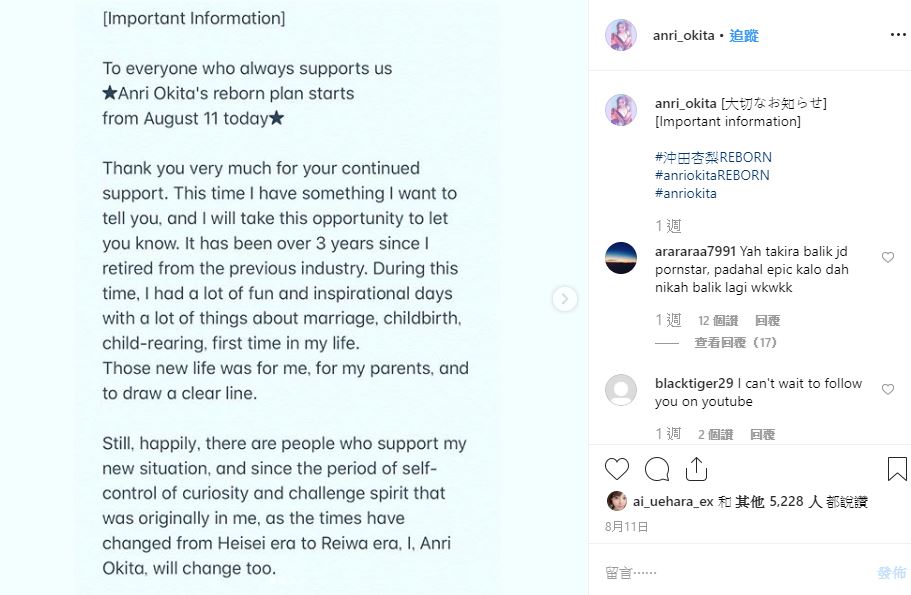 11日,沖田杏梨在個人IG張貼英日文雙語公告,宣佈「重生計畫」表示自己即將挑戰YouTuber。公告中坦言,退役三年來,作為人妻和人母相當開心也從中獲得靈感,同時感謝在這段時間仍然支持他的粉絲,對此,也有不少網友回應到「好想看你的片」、「不管你做什麼都會支持你的」。