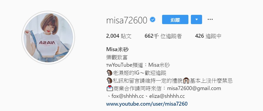 人氣網紅「米砂Misa」本來是一位Coser,有著可愛甜美的外型及姣好的身材,後來她轉戰Youtube,經營個人頻道「Misa米砂」,靠著辛辣尺度而被稱為「老司機」,在影片中總不諱言自己的性經驗,更常常談論很多人不好意思說出口的性事話題,因此給人一種大膽豪放的印象,而其坦率直接個性獲得不少人的支持,擁有很高的人氣,頻道有超過58萬人次訂閱數。