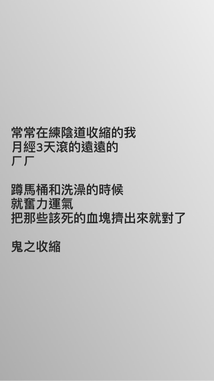 近日她在IG的限時動態裡再度開車,表示「常常在練陰道收縮的我,月經3天滾的遠遠的,蹲馬桶和洗澡的時候,就奮力運氣,把那些該死的血塊擠出來就對了」並稱自己「鬼之收縮」。