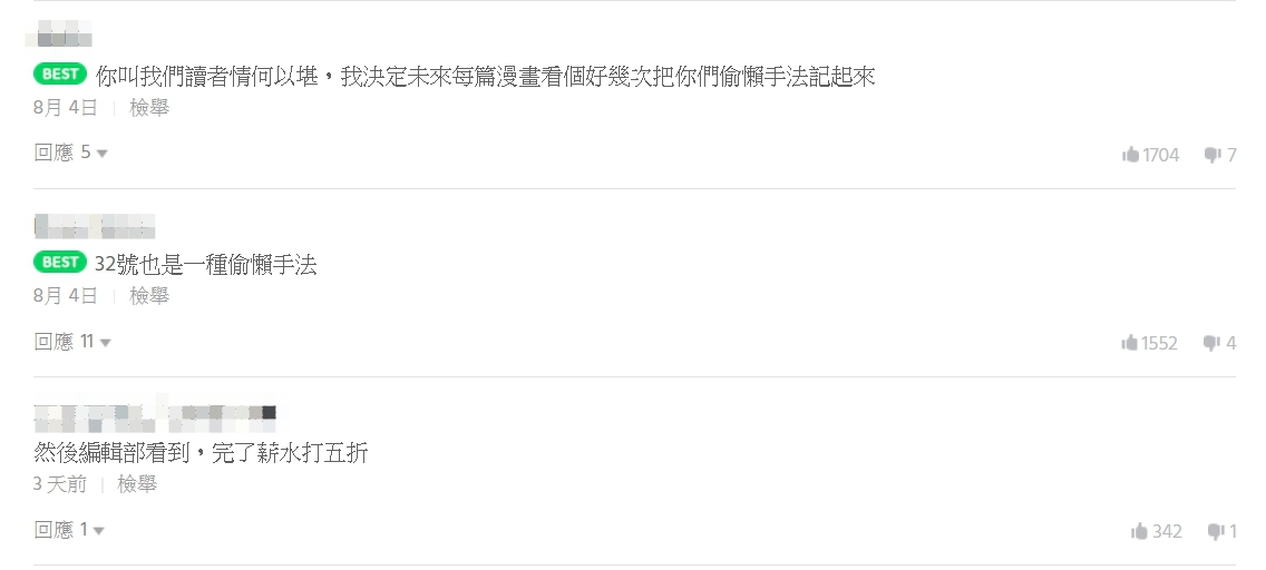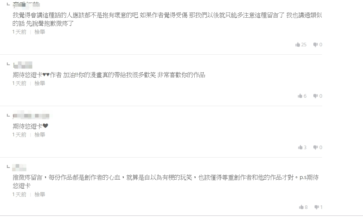 不少網友看到留言後紛紛安慰微疼,表示「作者辛苦了,不知道怎麼幫你打氣,只好坐等悠遊卡」、「你的漫畫真的帶給我很多歡笑,非常喜歡你的作品」、「每份作品都是創作者的心血,就算是自以為有梗的玩笑,也該懂得尊重創作者和他的作品才對」也有網友自我反省「我也講過類似的話,先說聲抱歉微疼了」