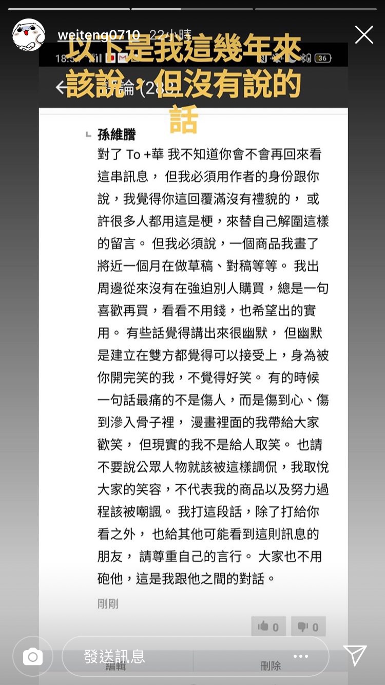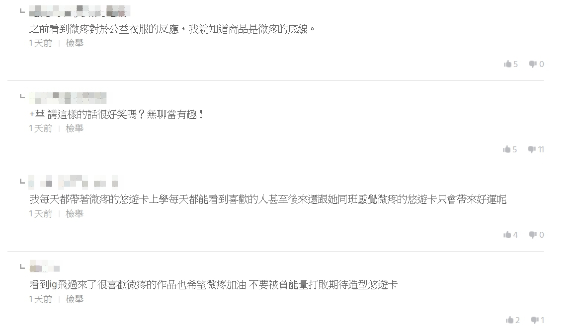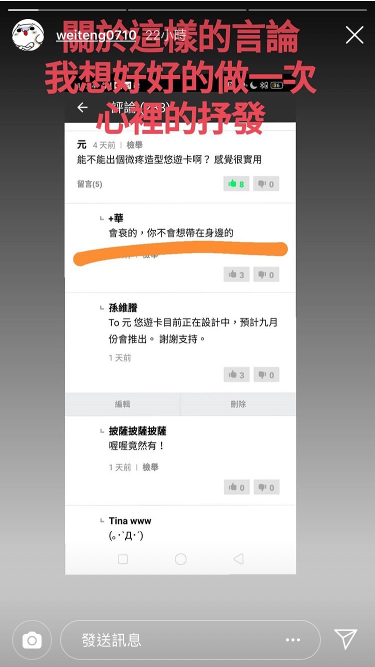 留言中也有網友興奮詢問「能不能出個微疼造型悠遊卡啊? 感覺很實用」結果有網友回覆「會衰的,你不會想帶在身邊」讓微疼氣得在IG上轉貼自己的想法,表示這樣的回覆很沒禮貌,或許很多人都用這是梗來替自己解圍,但對於花了大量心力在商品上得他而言並不好笑,也呼籲讀者並非公眾人物就該被這樣調侃,雖然他畫畫取悅大家,但是不代表做出來的商品以及努力過程該被嘲諷,提醒其他看到這則訊息的讀者,要尊重自己的言行,並補充「對方是公開留言,所以不要說他是公審」。