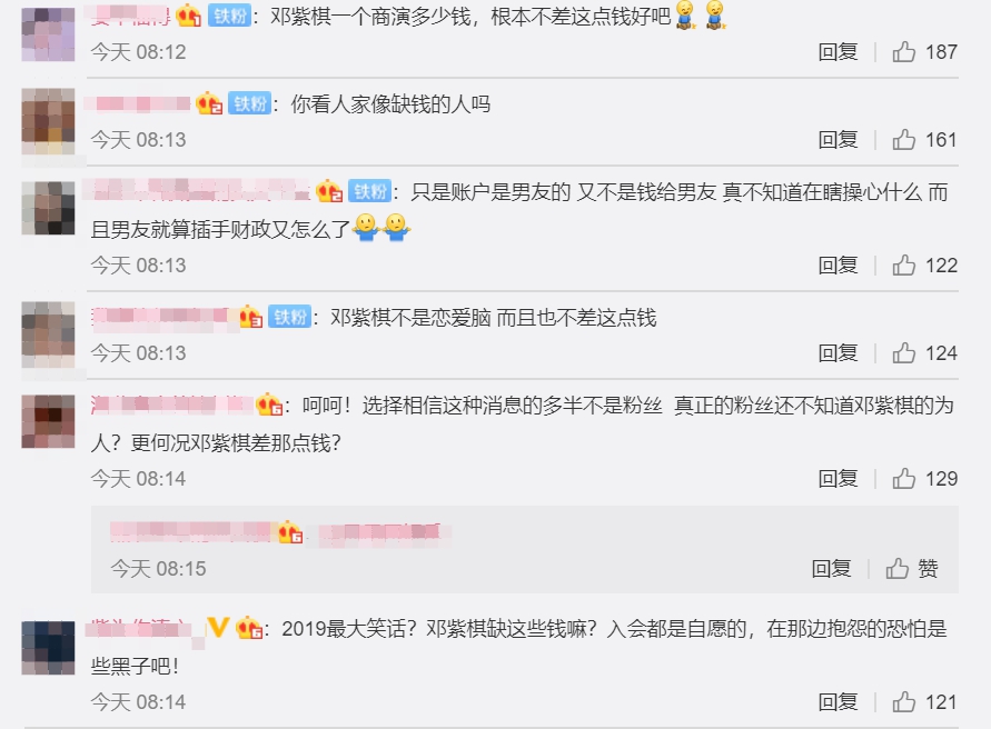 雖有網友批評,但多數粉絲力挺鄧紫棋,紛紛表示「鄧紫棋一個商演多少錢,根本不差這點錢」、「你看人家像缺錢的人嗎」、「鄧紫棋不是戀愛腦,而且也不差這點錢」並痛批「選擇相信這種消息的多半不是粉絲」,而鄧紫棋的經紀人對此也表示:「這類無稽的指控或謾罵攻擊,我們一向不予理會,大家亦不需杞人憂天、擔心太多」。