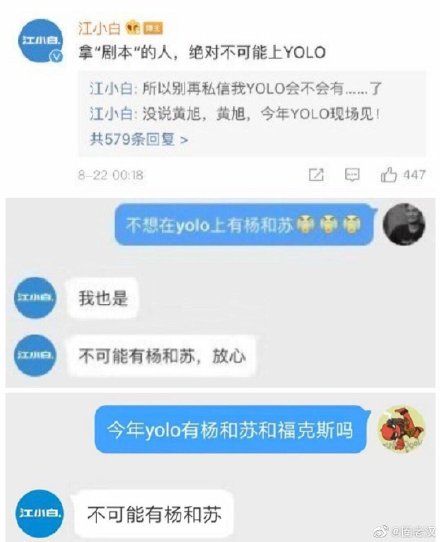 除了黃旭暗諷隊友之外,在22日晚間官方贊助商「江小白」也在微博上留言說道:「拿『劇本』的人,絕對不可能上YOLO(註:江小白YOLO青年文化節)」,接著就有網友私訊官方帳號說道:「不想在yolo上有楊和蘇」、「今年yolo有楊和蘇和福克斯嗎」,江小白也回應:「不可能有楊和蘇」,接著更回應網友說他有證據楊和蘇是拿劇本的人。在19號時,《中國新說唱》的音樂製作人「老道」也發文諷刺楊和蘇並非「Hiphop圈的人」,引起許多爭議。