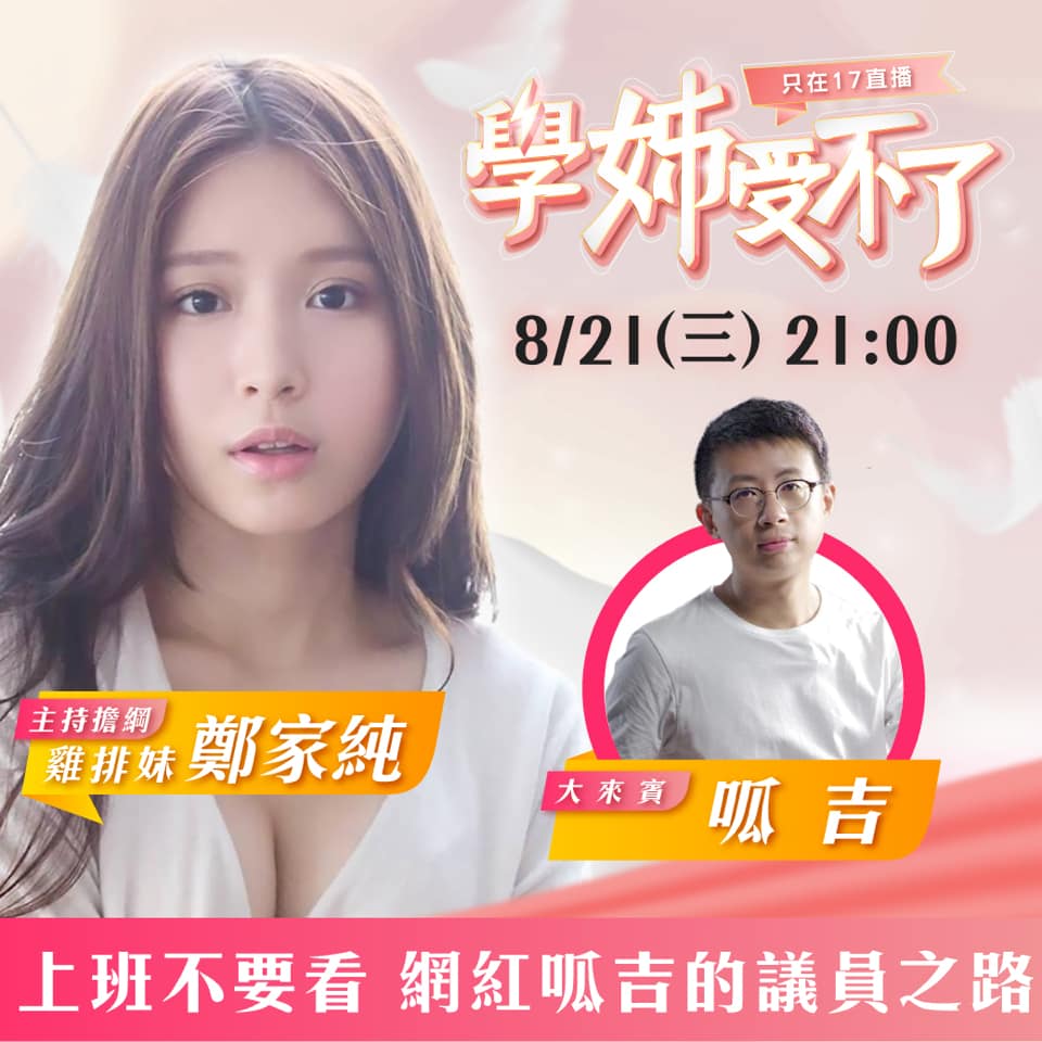 藝人「雞排妹」鄭家純在21日錄製直播節目《學姊受不了》時,邀請到從Youtube出身,現任台北市議員「呱吉」邱威傑,節目中呱吉帶來了自己小時候的照片,讓雞排妹也曬出自己幼稚園大班的泳裝照與高中「黑歷史」照,為節目掀起高潮。