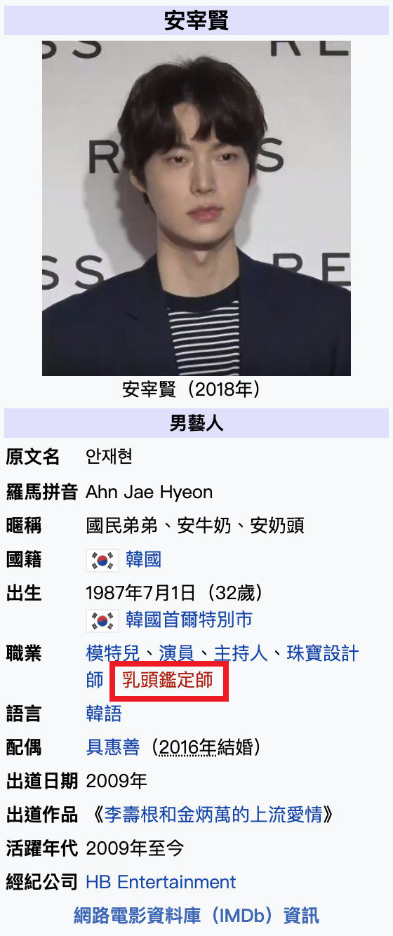 具惠善、安宰嫻18日驚爆婚變,具惠善先是出面指控老公對婚姻倦怠,且與多名女性在酒後有親密互動。接著具惠善又爆料,安宰賢嫌棄她「奶頭不性感」,因此一定要和她離婚。面對安宰賢一句又一句渣男的語錄,網友們紛紛砲轟開罵,甚至連維基百科也被惡搞,職業被加入「乳頭鑑定師」!