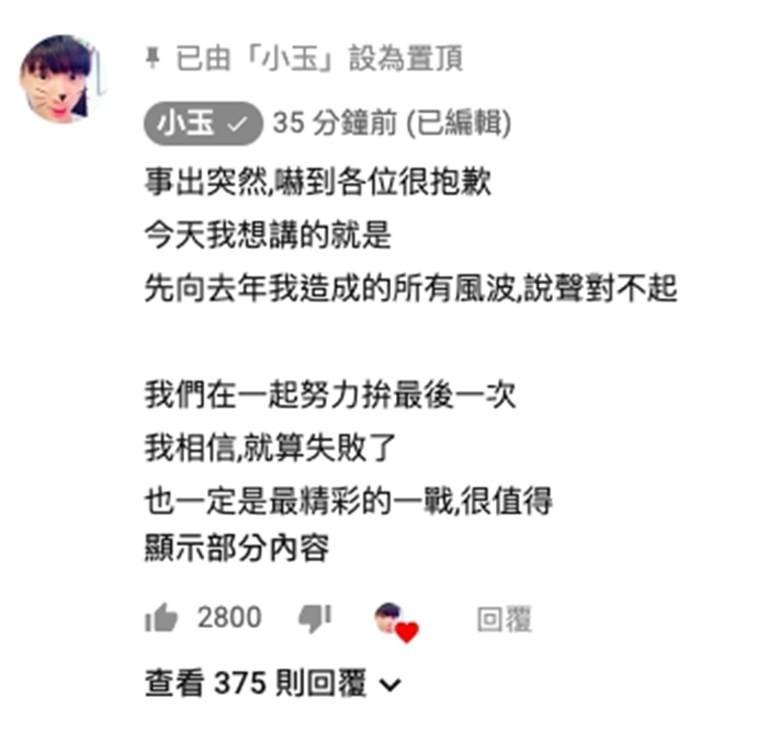 快訊 /爭議網紅「小玉」嚴肅發聲明「退出Youtube、向去年造成的所有風波致歉」 :絕對不是炒作!