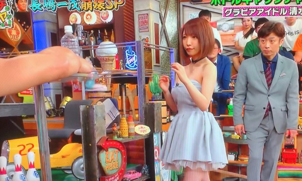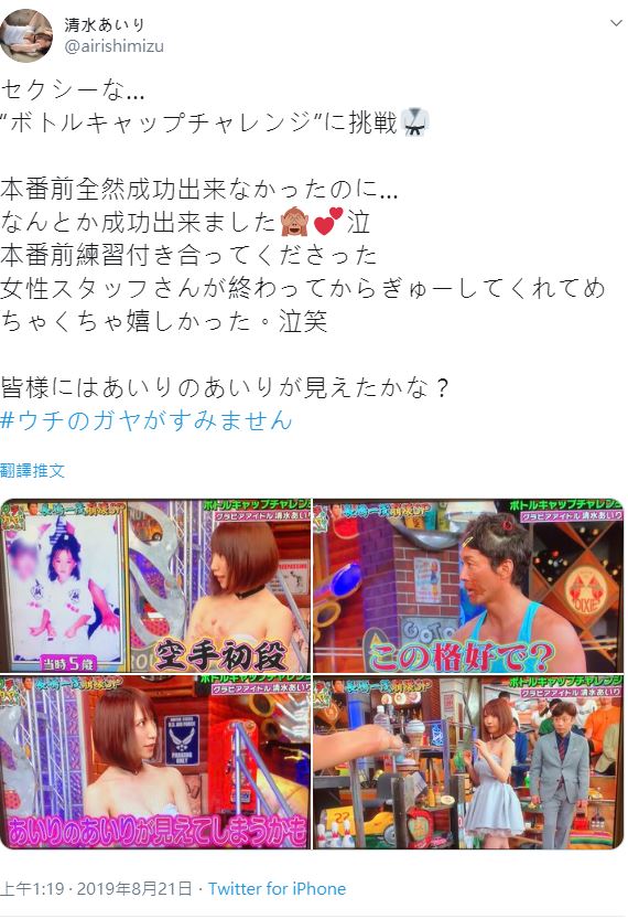 日本寫真女星清水藍里(清水あいり)因為擁有H罩杯的傲人身材出道就以節目《全力坂》走紅,不過此後也因為善於以個人魅力製造節目效果而上遍不少節目,像是他從小接觸的琉球空手道也意外成為賣點,甚至登上海內外新聞版面。20日,清水藍里在節目《ウチのガヤがすみません!》以空手道技能挑戰近日於網路社群流行的「踢瓶蓋」,更讓當天穿著膝上短裙的清水藍里在鏡頭前底褲大走光,再度製造話題。