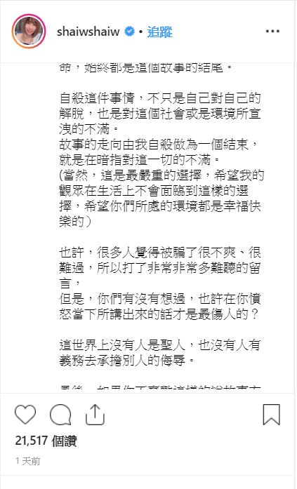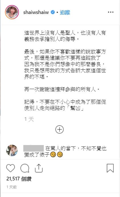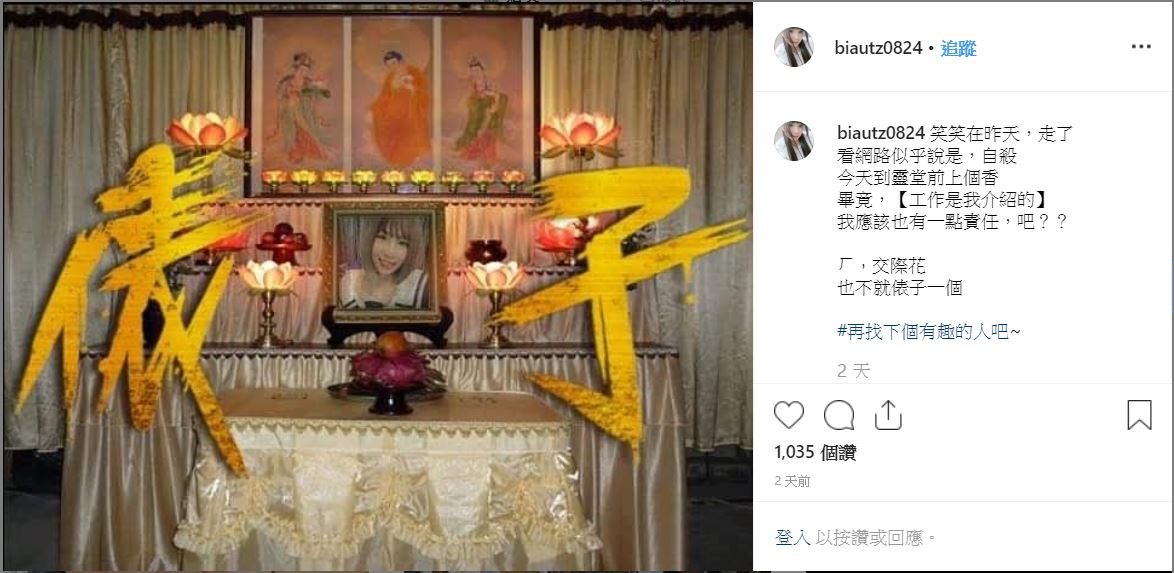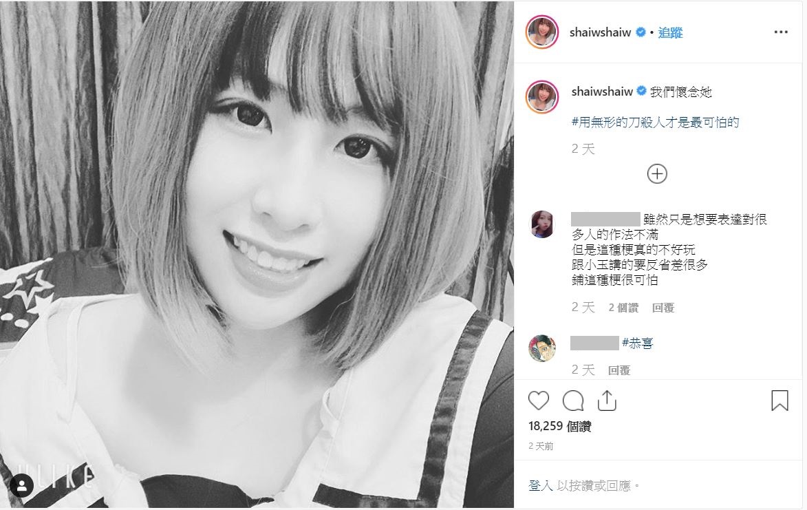 然而,就在兩天前「笑笑」和「啊媃」的IG上都發佈了類似的貼文,先是「笑笑」發了一張自己笑容燦爛的黑白照,並寫下「我們懷念她 #用無形的刀殺人才是最可怕的」,而在「啊媃」的IG上則PO出一張靈堂的照片,接著寫道「笑笑在昨天,走了!看網路似乎說是,自殺⠀」,種種字句皆導向「笑笑」已自殺身亡。