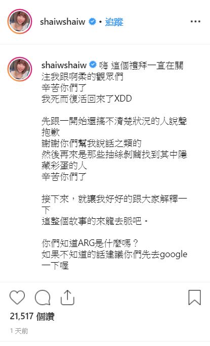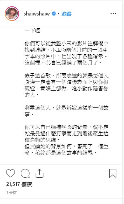 不料這名女生似乎不為所動,之後又陸續PO了許多和「笑笑」相關的貼文,而這也令網友們開始認為事有蹊蹺,更發現「笑笑」和「小玉」都追蹤了這名女生的IG,而且笑笑也曾在IG上表示「期待新作品」,因此眾人推論應該是為了新作品而鋪下的「梗」。