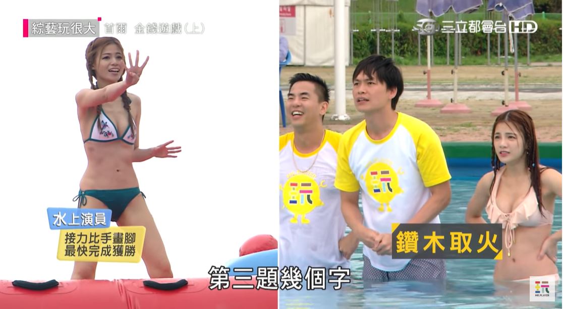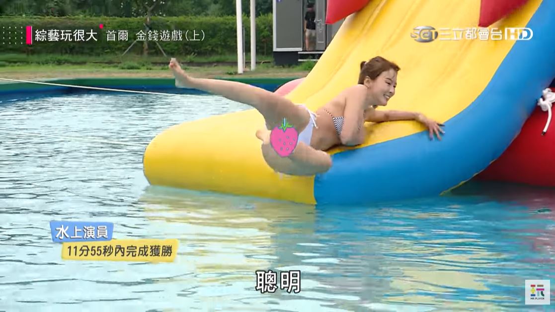 然而,更令觀眾們瞠目結舌的其實是眾人在進行「水上演員」關卡時,只見女來賓們全都奮力地爬上立在水面上的充氣滑梯,像是林莎為了能夠快速登頂,完成比手畫腳的步驟,努力地攀爬著又滑又濕的充氣墊,無奈卻頻頻滑落,撲倒在充氣墊上,甚至一度走光,還被製作團隊P上了小草莓。