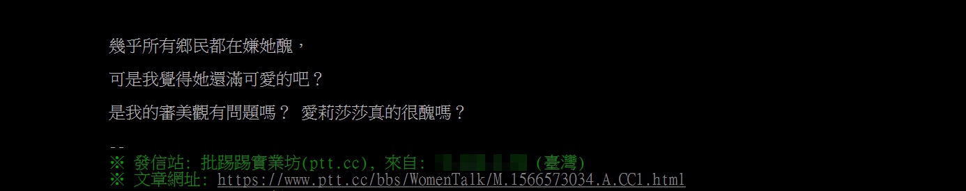 發文者表示近期有一篇愛莉莎莎的新聞,但是底下的留言幾乎一面倒認為愛莉莎莎長的不好看,讓他疑惑表示「PPT幾乎所有鄉民都嫌愛莉莎莎醜,可是我覺得她還滿可愛的吧?是我的審美觀有問題嗎?愛莉莎莎真的很醜嗎?」並附上PTT的討論,引發正反兩極的評論,雖有網友贊同他「我的審美覺得她蠻漂亮的」、「酸葡萄一堆,反指標別在意」但也有網友認為「說可愛的是不是沒看過可愛的女生啊= =」、「有種討人厭的醜」、「不醜但也沒特別正」。